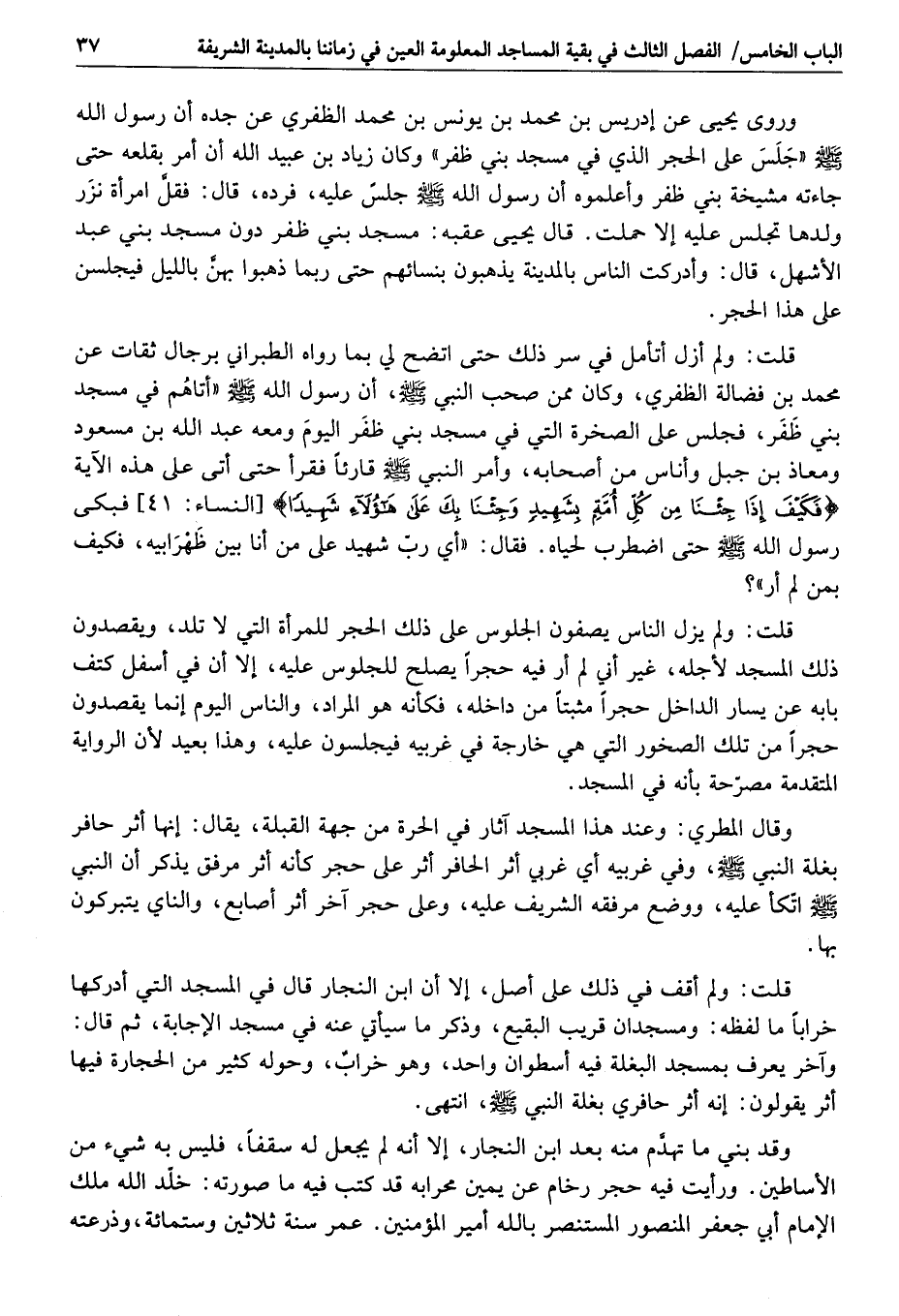 قلت: ولم أزل أتأمل في سر ذلك حتى اتضح لي بما رواه الطبراني برجال ثقات عن محمد بن فضالة الظفري، وكان ممن صحب النبي صلى الله عليه وسلم، أن رسول الله صلى الله عليه وسلم «أتاهم في مسجد بني ظفر، فجلس على الصخرة التي في مسجد بني ظفر اليوم ومعه عبد الله بن مسعود ومعاذ بن جبل وأناس من أصحابه، وأمر النبي صلى الله عليه وسلم قارئا فقرأ حتى أتى على هذه الآية فَكَيْفَ إِذا جِئْنا مِنْ كُلِّ أُمَّةٍ بِشَهِيدٍ وَجِئْنا بِكَ عَلى هؤُلاءِ شَهِيداً [النساء: 41] فبكى رسول الله صلى الله عليه وسلم حتى اضطرب لحياه. فقال: «أي ربّ شهيد على من أنا بين ظهرابيه، فكيف بمن لم أر» ؟