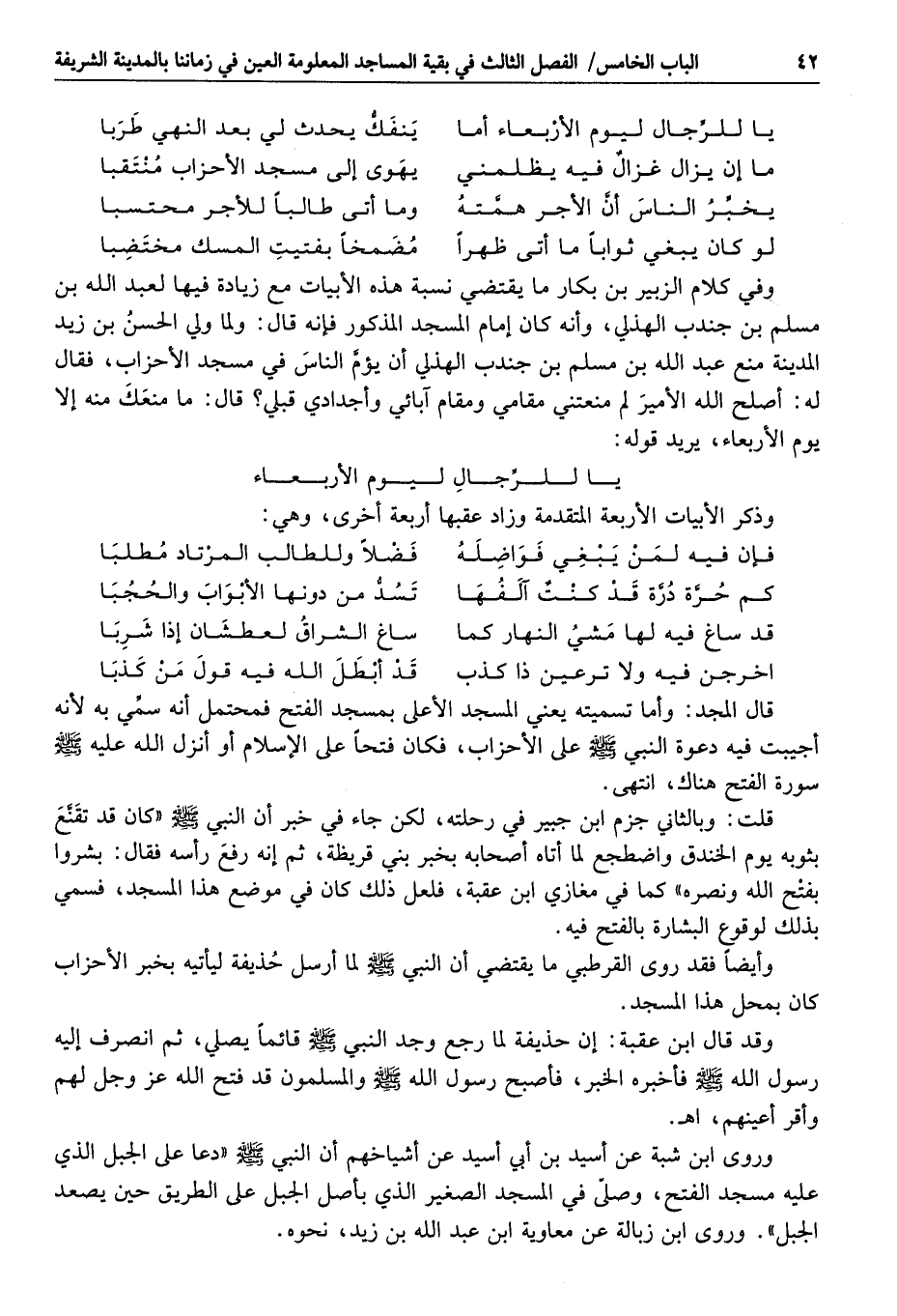 وفي كلام الزبير بن بكار ما يقتضي نسبة هذه الأبيات مع زيادة فيها لعبد الله بن مسلم بن جندب الهذلي، وأنه كان إمام المسجد المذكور فإنه قال: ولما ولي الحسن بن زيد المدينة منع عبد الله بن مسلم بن جندب الهذلي أن يؤمّ الناس في مسجد الأحزاب، فقال له: أصلح الله الأمير لم منعتني مقامي ومقام آبائي وأجدادي قبلي؟ قال: ما منعك منه إلا يوم الأربعاء، يريد قوله: