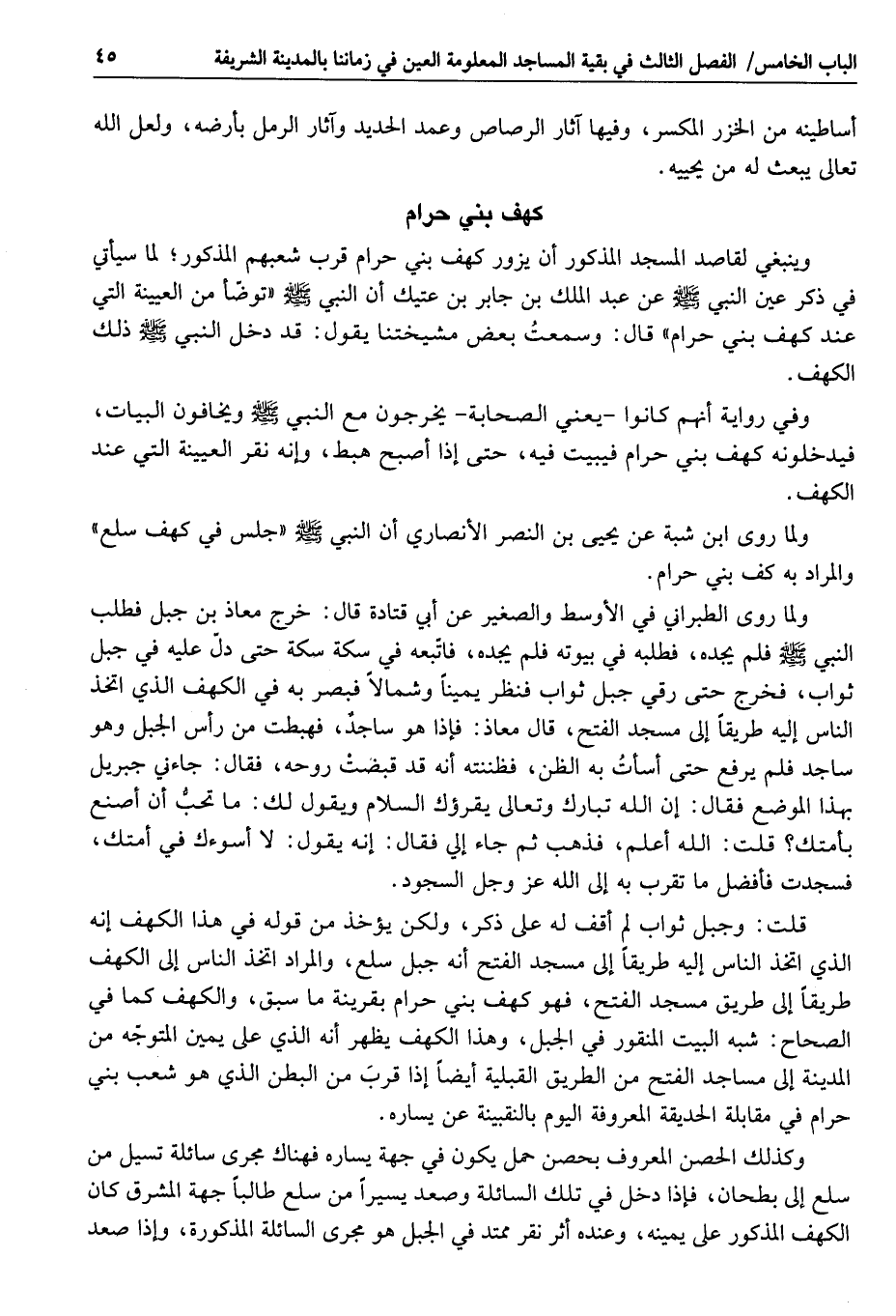 وينبغي لقاصد المسجد المذكور أن يزور كهف بني حرام قرب شعبهم المذكور؛ لما سيأتي في ذكر عين النبي صلى الله عليه وسلم عن عبد الملك بن جابر بن عتيك أن النبي صلى الله عليه وسلم «توضّأ من العيينة التي عند كهف بني حرام» قال: وسمعت بعض مشيختنا يقول: قد دخل النبي صلى الله عليه وسلم ذلك الكهف.
