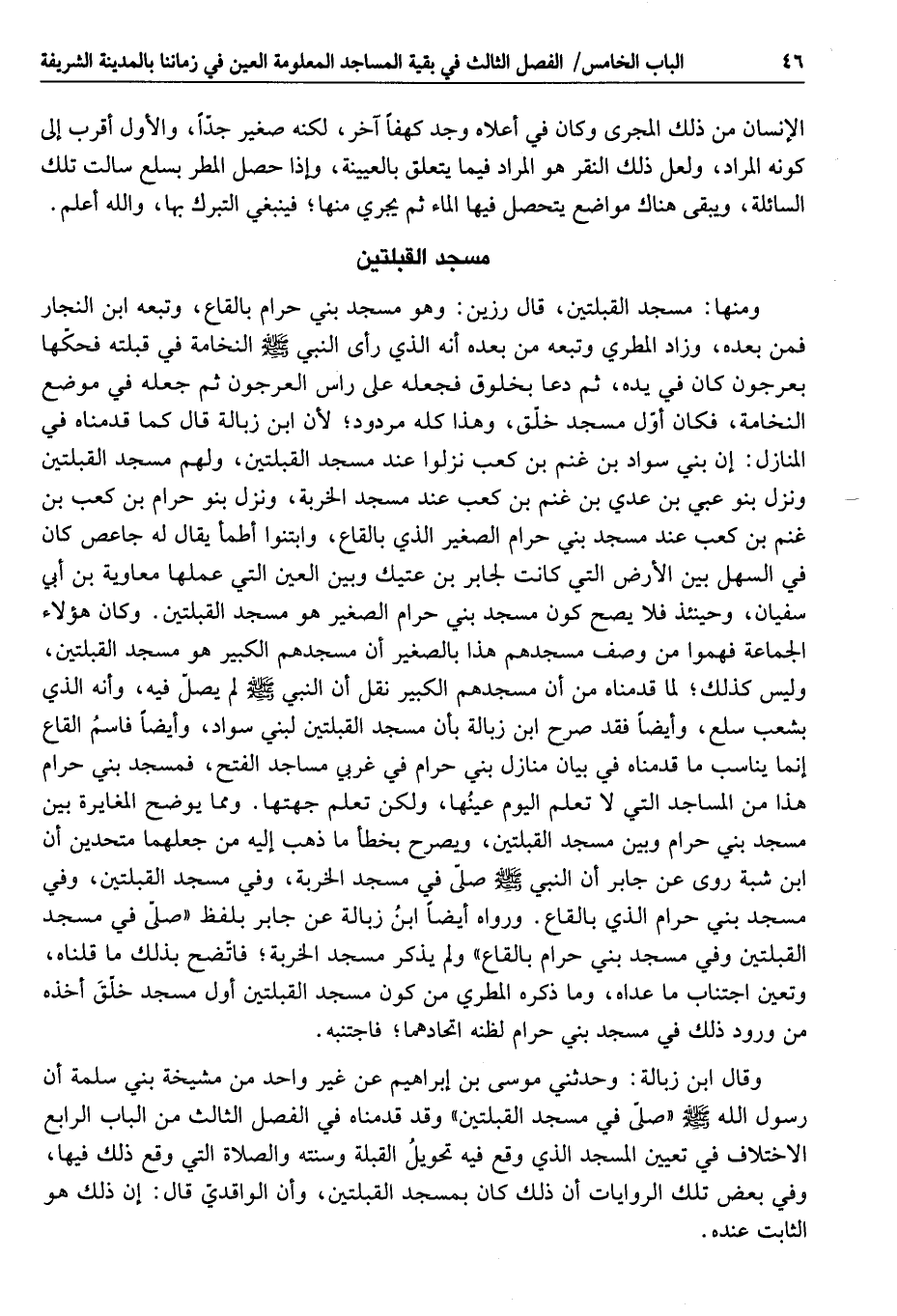 وقال ابن زبالة: وحدثني موسى بن إبراهيم عن غير واحد من مشيخة بني سلمة أن رسول الله صلى الله عليه وسلم «صلّى في مسجد القبلتين» وقد قدمناه في الفصل الثالث من الباب الرابع الاختلاف في تعيين المسجد الذي وقع فيه تحويل القبلة وسنته والصلاة التي وقع ذلك فيها، وفي بعض تلك الروايات أن ذلك كان بمسجد القبلتين، وأن الواقديّ قال: إن ذلك هو الثابت عنده.