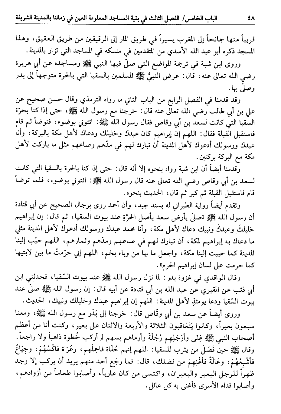 وقد قدمنا في الفصل الرابع من الباب الثاني ما رواه الترمذي وقال حسن صحيح عن علي بن أبي طالب رضي الله تعالى عنه قال: خرجنا مع رسول الله صلى الله عليه وسلم، حتى إذا كنا بحرّة السقيا التي كانت لسعد بن أبي وقاص فقال رسول الله صلى الله عليه وسلم: ائتوني بوضوء، فتوضأ ثم قام فاستقبل القبلة فقال: اللهم إن إبراهيم كان عبدك وخليلك ودعاك لأهل مكة بالبركة، وأنا عبدك ورسولك أدعوك لأهل المدينة أن تبارك لهم في مدّهم وصاعهم مثل ما باركت لأهل مكة مع البركة بركتين.
