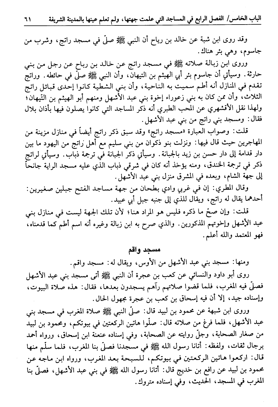 وروى ابن زبالة صلاته صلى الله عليه وسلم في مسجد راتج عن خالد بن رباح عن رجل من بني حارثة. وسيأتي أن جاسوم بئر أبي الهيثم بن التيهان، وأن النبي صلى الله عليه وسلم صلّى في حائطه. وراتج تقدم في المنازل أنه أطم سميت به الناحية، وأن بني الشطية كانوا إحدى قبائل راتج الثلاث، وأن ممن كان به بني زعوراء إخوة بني عبد الأشهل ومنهم أبو الهيثم بن التّيهان؛ ولهذا نقل الأقشهري عن المحب الطبري أنه ذكر المساجد التي كانوا يصلون فيها بأذان بلال فقال: ومسجد بني راتج من بني عبد الأشهل.