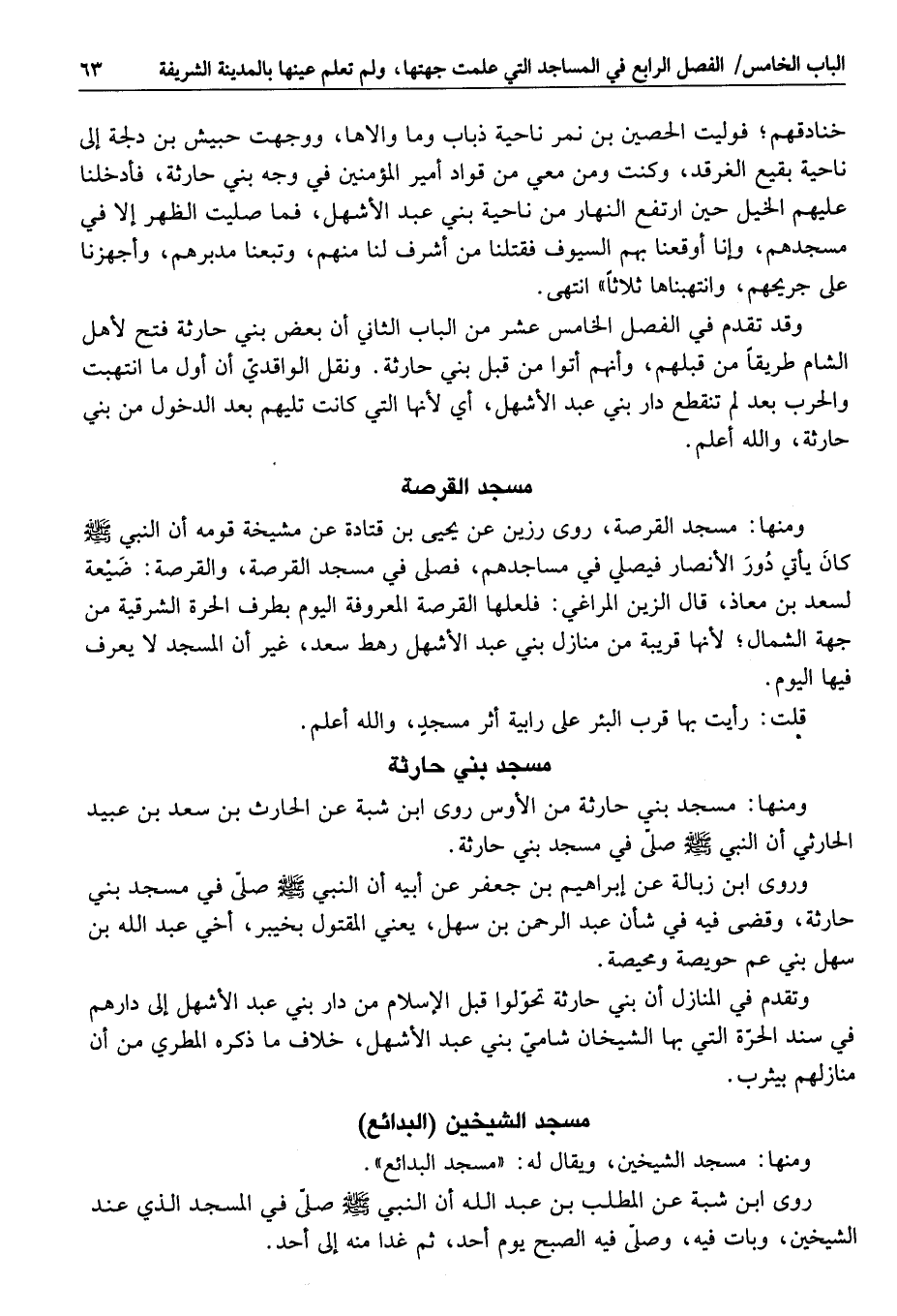 وتقدم في المنازل أن بني حارثة تحوّلوا قبل الإسلام من دار بني عبد الأشهل إلى دارهم في سند الحرّة التي بها الشيخان شاميّ بني عبد الأشهل، خلاف ما ذكره المطري من أن منازلهم بيثرب.