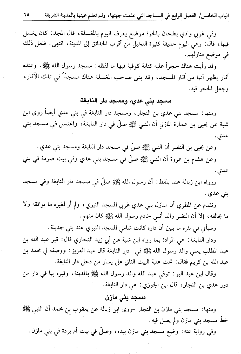 ورواه ابن زبالة عند بلفظ: أن رسول الله صلى الله عليه وسلم صلّى في مسجد دار النابغة وفي مسجد بني عدي.
