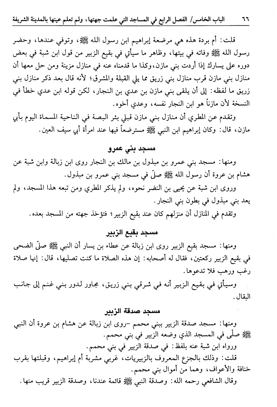 ومنها: مسجد صدقة الزبير ببني محمم- روى ابن زبالة عن هشام بن عروة أن النبي صلى الله عليه وسلم صلّى في المسجد الذي وضعه الزبير في بني محمم.