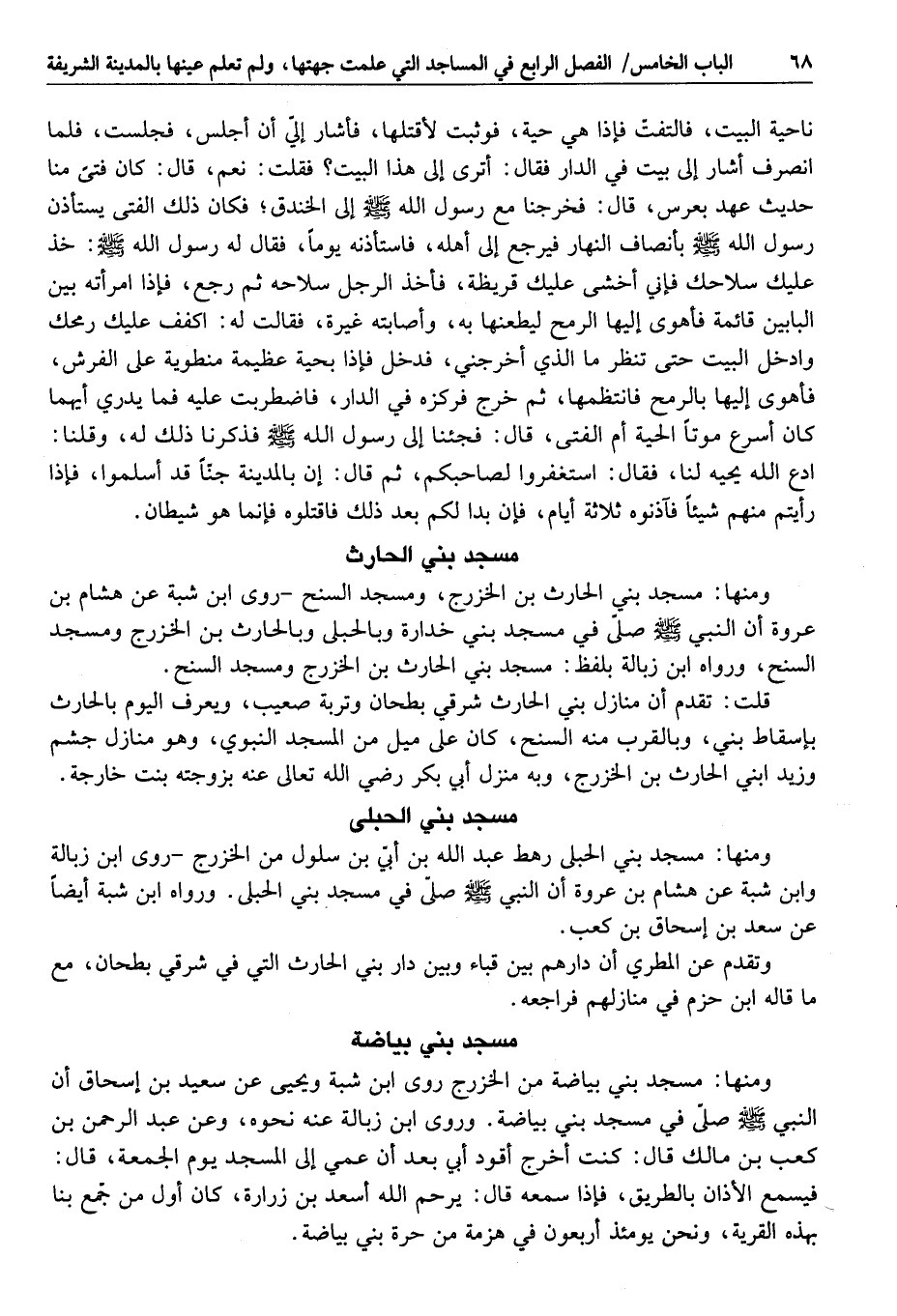 ومنها: مسجد بني الحبلى رهط عبد الله بن أبيّ بن سلول من الخزرج- روى ابن زبالة وابن شبة عن هشام بن عروة أن النبي صلى الله عليه وسلم صلّى في مسجد بني الحبلى. ورواه ابن شبة أيضا عن سعد بن إسحاق بن كعب.