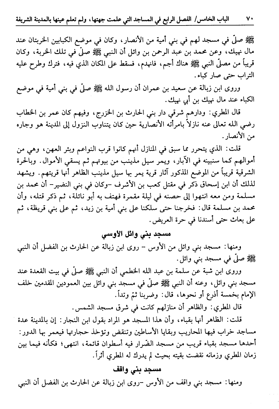 ومنها: مسجد بني وائل من الأوس- روى ابن زبالة عن الحارث بن الفضل أن النبي صلى الله عليه وسلم صلّى في مسجد بني وائل.