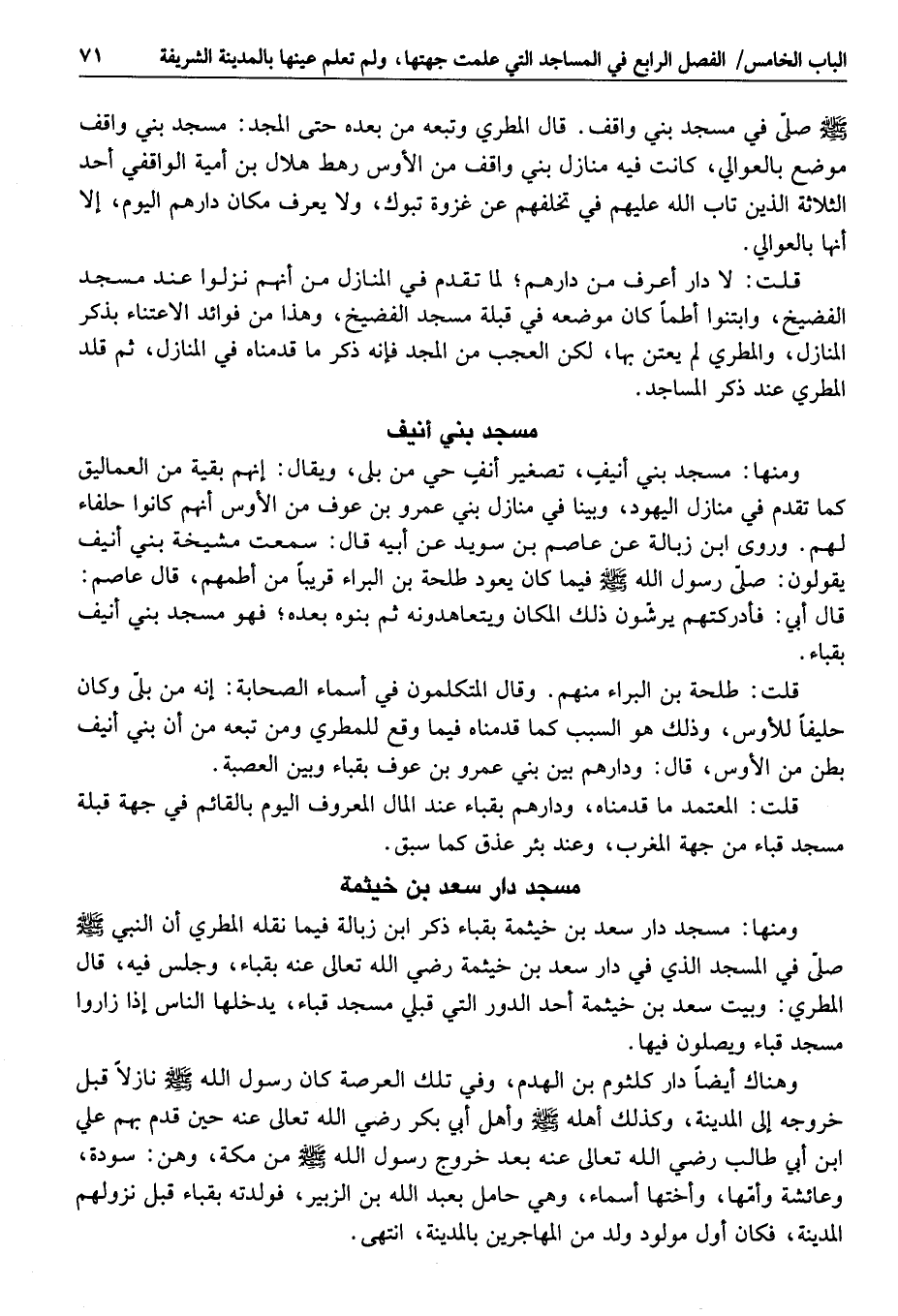 قلت: لا دار أعرف من دارهم؛ لما تقدم في المنازل من أنهم نزلوا عند مسجد الفضيخ، وابتنوا أطما كان موضعه في قبلة مسجد الفضيخ، وهذا من فوائد الاعتناء بذكر المنازل، والمطري لم يعتن بها، لكن العجب من المجد فإنه ذكر ما قدمناه في المنازل، ثم قلد المطري عند ذكر المساجد.
