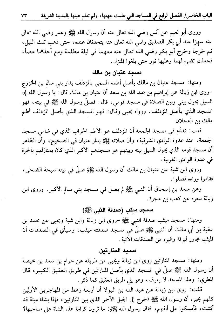 ومنها: مسجد المنارتين روى ابن زبالة ويحيى من طريقه عن حرام بن سعد بن محيصة أن رسول الله صلى الله عليه وسلم صلّى في المسجد الذي بأصل المنارتين في طريق العقيق الكبير، قال المطري: وهذا المسجد لا يعرف، وهو يلي طريق العقيق كما ذكر.