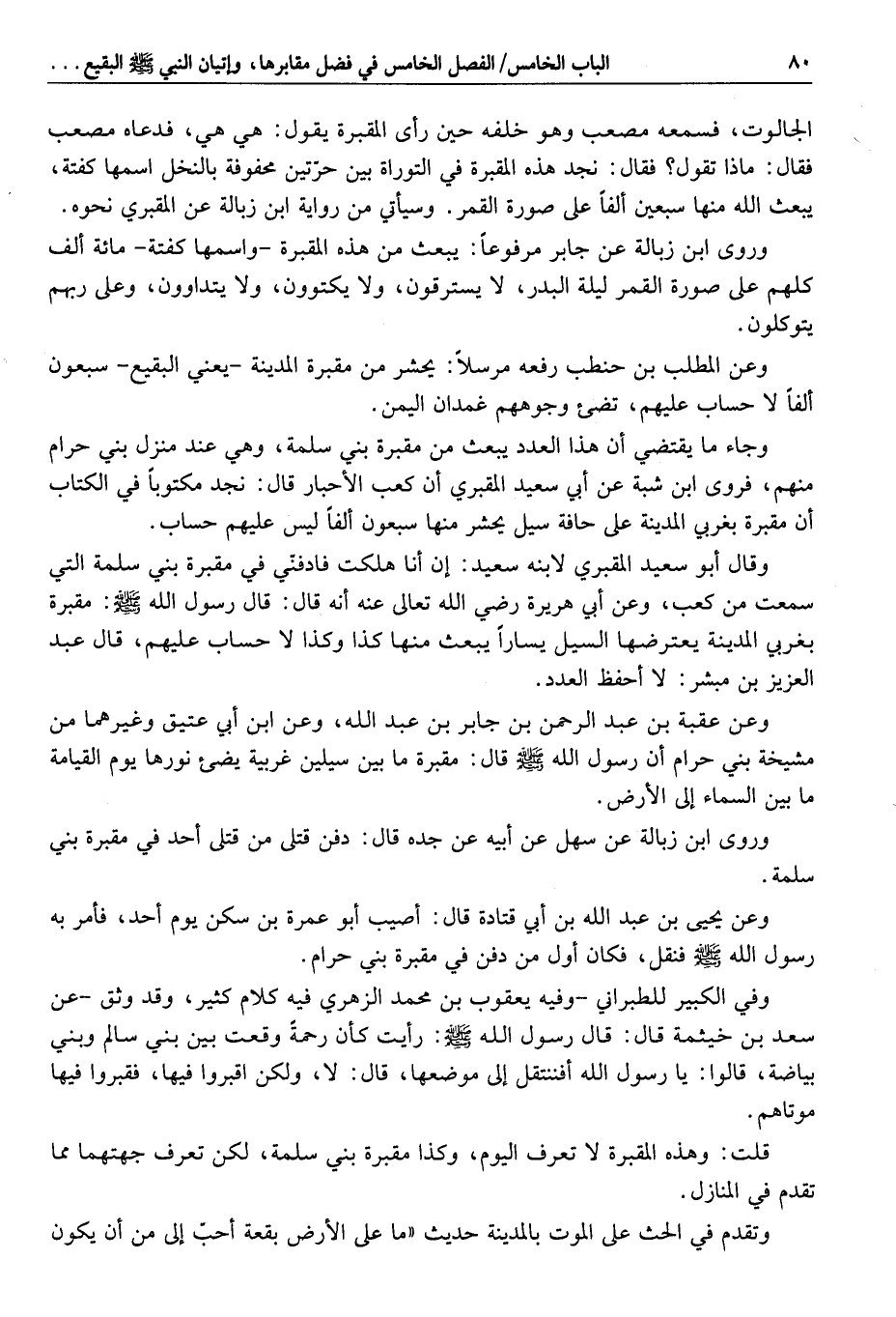 وروى ابن زبالة عن جابر مرفوعا: يبعث من هذه المقبرة- واسمها كفتة- مائة ألف كلهم على صورة القمر ليلة البدر، لا يسترقون، ولا يكتوون، ولا يتداوون، وعلى ربهم يتوكلون.