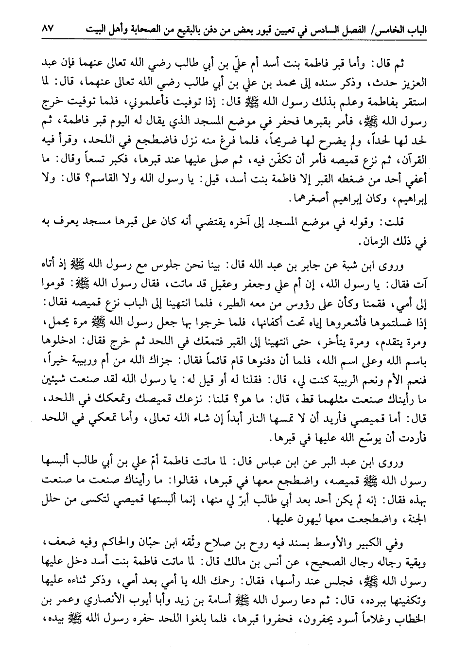 ثم قال: وأما قبر فاطمة بنت أسد أم عليّ بن أبي طالب رضي الله تعالى عنهما فإن عبد العزيز حدث، وذكر سنده إلى محمد بن علي بن أبي طالب رضي الله تعالى عنهما، قال: لما استقر بفاطمة وعلم بذلك رسول الله صلى الله عليه وسلم قال: إذا توفيت فأعلموني، فلما توفيت خرج رسول الله صلى الله عليه وسلم، فأمر بقبرها فحفر في موضع المسجد الذي يقال له اليوم قبر فاطمة، ثم لحد لها لحدا، ولم يضرح لها ضريحا، فلما فرغ منه نزل فاضطجع في اللحد، وقرأ فيه القرآن، ثم نزع قميصه فأمر أن تكفّن فيه، ثم صلى عليها عند قبرها، فكبر تسعا وقال: ما أعفي أحد من ضغطه القبر إلا فاطمة بنت أسد، قيل: يا رسول الله ولا القاسم؟ قال: ولا إبراهيم، وكان إبراهيم أصغر هما.