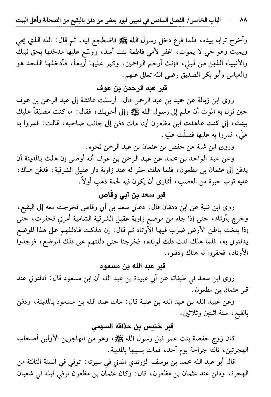 وعن عبد الواحد بن محمد عن عبد الرحمن بن عوف أنه أوصى إن هلك بالمدينة أن يدفن إلى عثمان بن مظعون، فلما هلك حفر له عند زاوية دار عقيل الشرقية، فدفن هناك، عليه ثوب حبرة من العصب، أتمارى أن يكون فيه لحمة ذهب أولا.