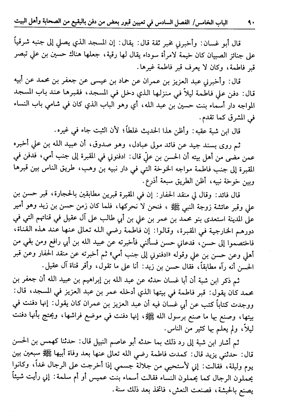 ثم ذكر ابن شبة أن أبا غسان حدثه عن عبد الله بن إبراهيم بن عبيد الله أن جعفر بن محمد كان يقول: قبر فاطمة في بيتها الذي أدخله عمر بن عبد العزيز في المسجد، قال: