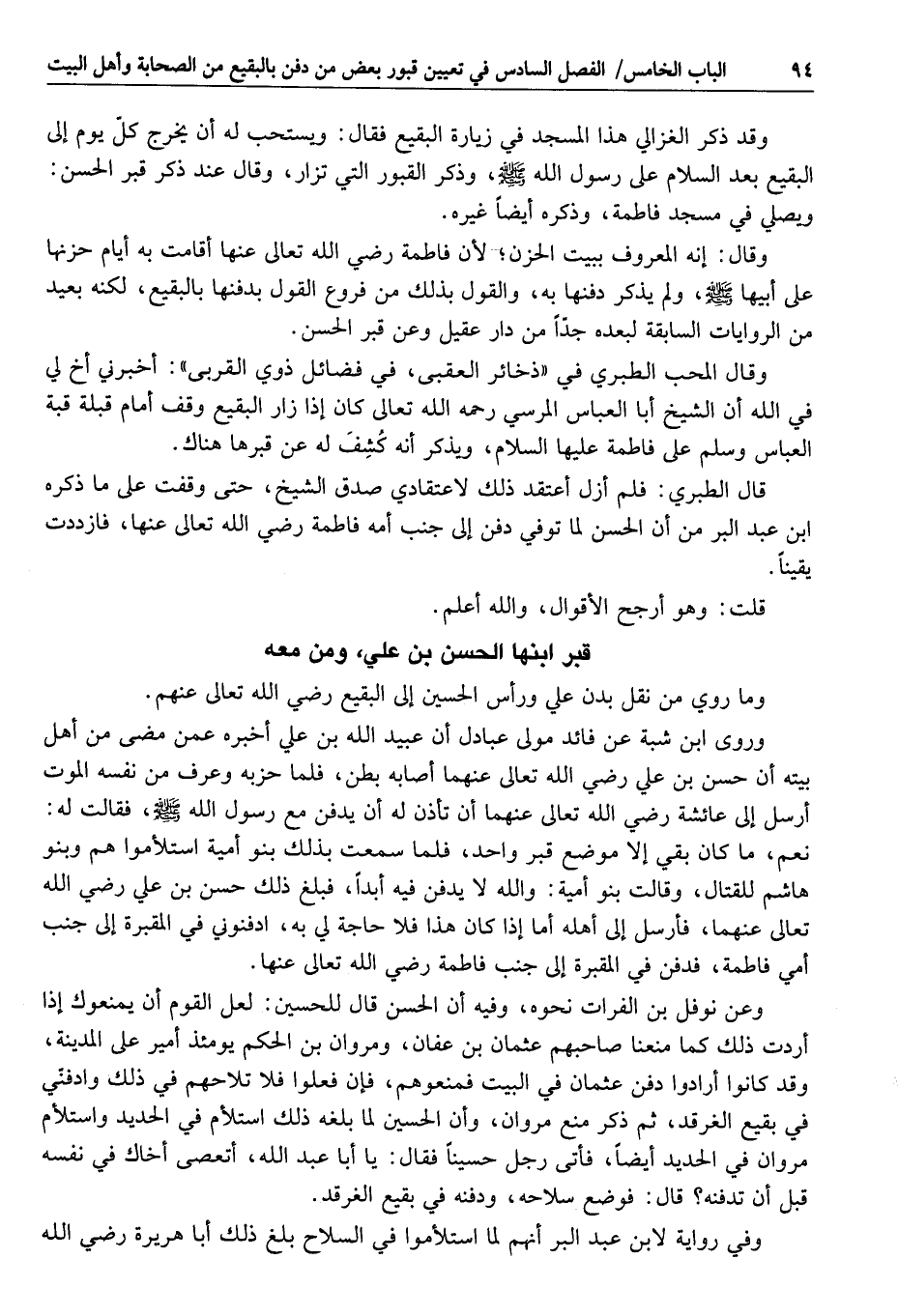 وقال: إنه المعروف ببيت الحزن؛ لأن فاطمة رضي الله تعالى عنها أقامت به أيام حزنها على أبيها صلى الله عليه وسلم، ولم يذكر دفنها به، والقول بذلك من فروع القول بدفنها بالبقيع، لكنه بعيد من الروايات السابقة لبعده جدّا من دار عقيل وعن قبر الحسن.