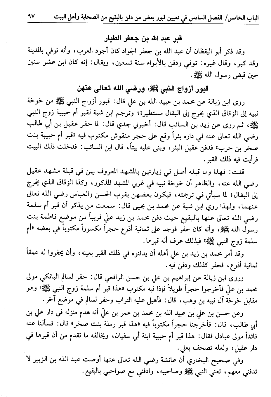 قلت: فهذا وما قبله أصل في زيارتهن بالمشهد المعروف بهن في قبلة مشهد عقيل رضي الله عنه، والظاهر أن خوخة نبيه في غربي المشهد المذكور، وكذا الزقاق الذي يخرج إلى البقال؛ لما سيأتي في ترجمته، فيكون بعضهن بقرب الحسن والعباس رضي الله تعالى عنهما، ولهذا روي ابن شبة عن محمد بن يحيى قال: سمعت من يذكر أن قبر أم سلمة رضي الله تعالى عنها بالبقيع حيث دفن محمد بن زيد عليّ قريبا من موضع فاطمة بنت رسول الله صلى الله عليه وسلم، وأنه كان حفر فوجد على ثمانية أذرع حجرا مكسورا مكتوبا في بعضه «أم سلمة زوج النبي صلى الله عليه وسلم» فبذلك عرف أنه قبرها.