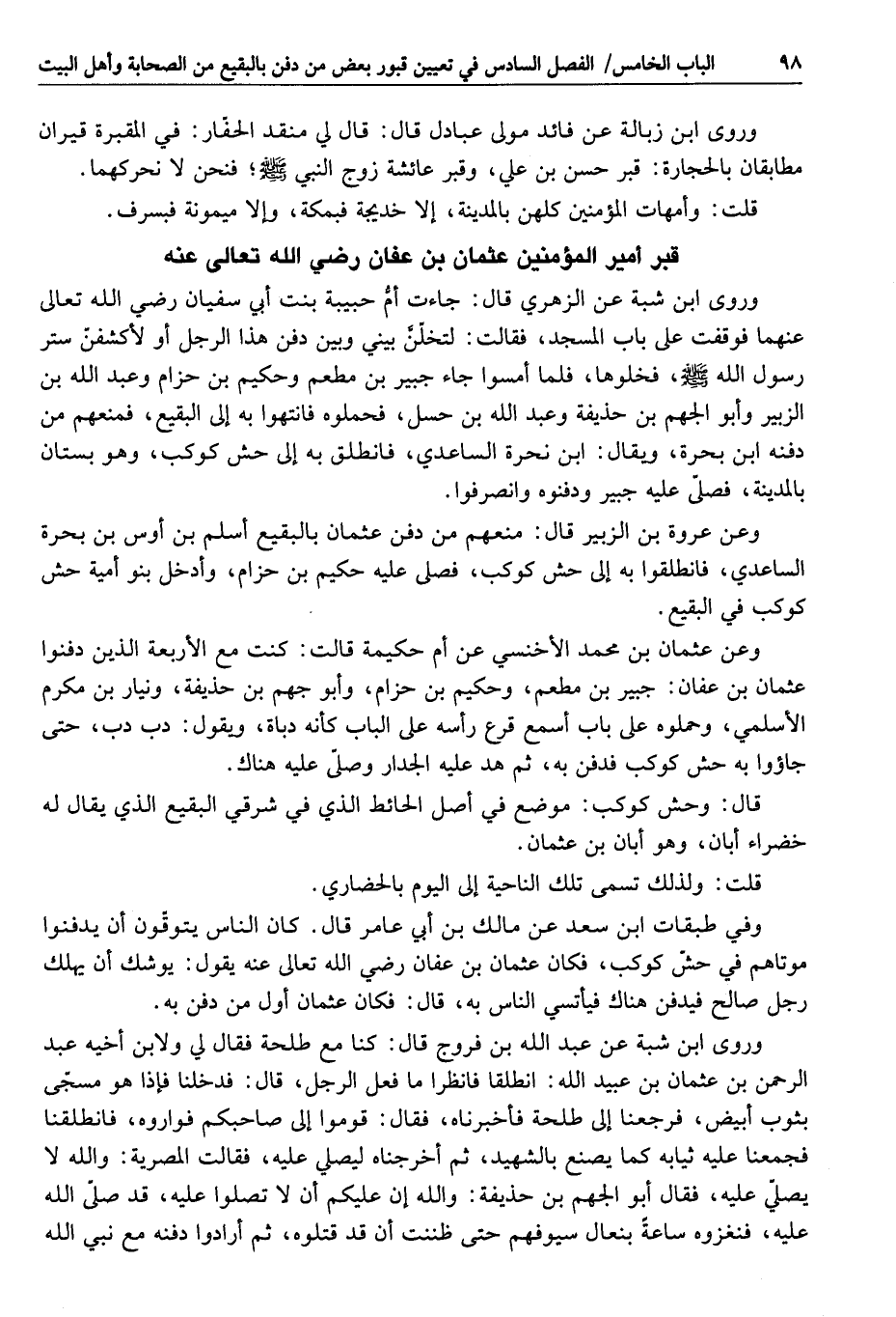 وعن عثمان بن محمد الأخنسي عن أم حكيمة قالت: كنت مع الأربعة الذين دفنوا عثمان بن عفان: جبير بن مطعم، وحكيم بن حزام، وأبو جهم بن حذيفة، ونيار بن مكرم الأسلمي، وحملوه على باب أسمع قرع رأسه على الباب كأنه دباة، ويقول: دب دب، حتى جاؤوا به حش كوكب فدفن به، ثم هد عليه الجدار وصلّى عليه هناك.