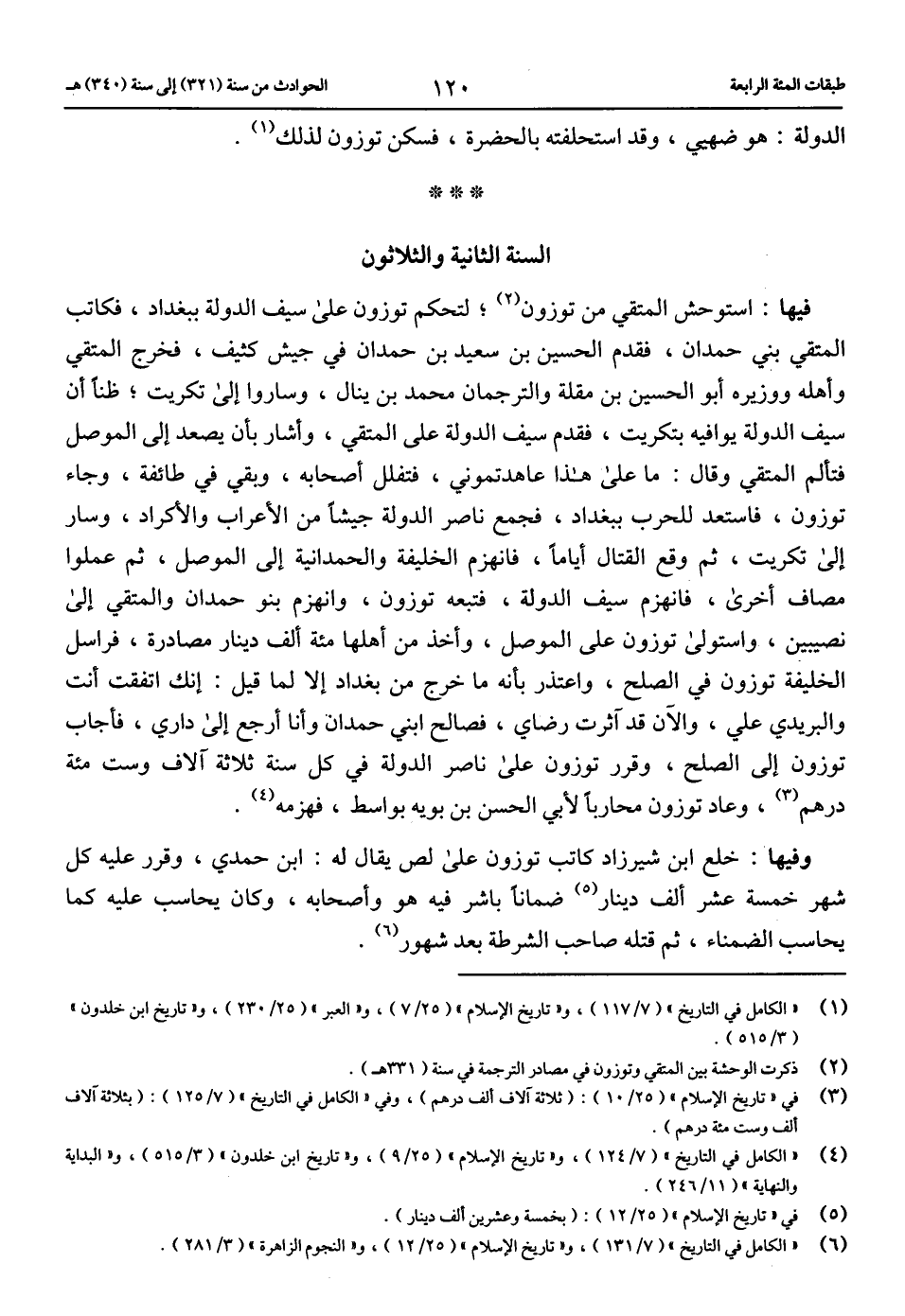 (2) ذكرت الوحشة بين المتقي وتوزون في مصادر الترجمة في سنة (331 هـ).