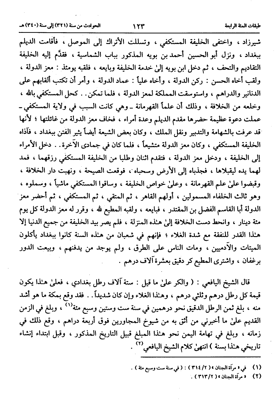 شيرزاد، واختفى الخليفة المستكفي، وتسللت الأتراك إلى الموصل، فأقامت الديلم ببغداد، ونزل أبو الحسين أحمد بن بويه المذكور بباب الشماسية، فقدّم إليه الخليفة التقاديم والتحف، ثم دخل ابن بويه إلى خدمة الخليفة وبايعه، فلقبه يومئذ: معز الدولة، ولقب أخاه الحسن: ركن الدولة، وأخاه عليا: عماد الدولة، وأمر أن تكتب ألقابهم على الدنانير والدراهم، واستوسقت المملكة لمعز الدولة، فلما تمكن .. كحل المستكفي بالله، وخلعه من الخلافة، وذلك أن علما القهرمانة-وهي كانت السبب في ولاية المستكفي- عملت دعوة عظيمة حضرها مقدم الديلم وعدة أمراء، فخاف معز الدولة من غائلتها؛ لأنها قد عرفت بالشهامة والتدبير ونقل الملك، وكان بعض الشيعة أيضا يثير الفتن ببغداد، فآذاه الخليفة المستكفي، وكان معز الدولة متشيعا، فلما كان في جمادى الآخرة .. دخل الأمراء إلى الخليفة، ودخل معز الدولة، فتقدم اثنان وطلبا من الخليفة المستكفي رزقهما، فمد لهما يده ليقبلاها، فجذباه إلى الأرض وسحباه، فوقعت الصيحة، ونهبت دار الخلافة، وقبضوا على علم القهرمانة، وعلى خواص الخليفة، وساقوا المستكفي ماشيا، وسملوه، وهو ثالث الخلفاء المسمولين، أولهم القاهر، ثم المتقي، ثم المستكفي، ثم أحضر معز الدولة أبا القاسم الفضل بن المقتدر، فبايعه، ولقبه المطيع لله، وقرر له معز الدولة كل يوم مائة دينار، وانحط دست الخلافة إلى هذه المنزلة، فلم يصر بيد الخليفة من جميع الدنيا إلا هذا القدر للنفقة مع شدة الغلاء؛ فإنهم في شعبان من هذه السنة كانوا ببغداد يأكلون الميتات والآدميين، ومات الناس على الطرق، ولم يوجد من يدفنهم، وبيعت الدور برغفان، واشترى المطيع كر دقيق بعشرة آلاف درهم.