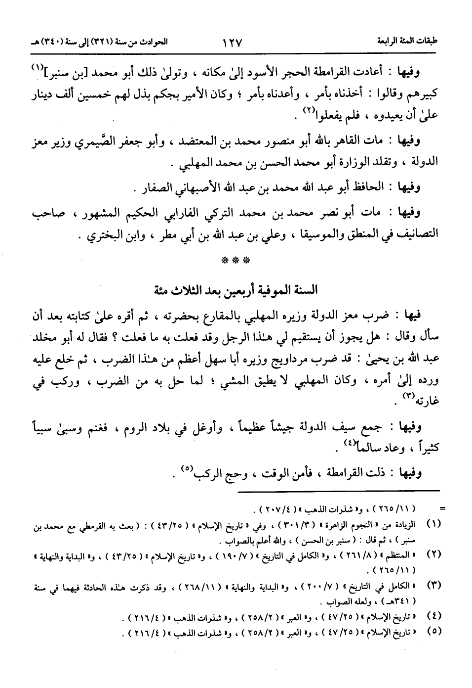 (3) «الكامل في التاريخ» (7/ 200)، و «البداية والنهاية» (11/ 268)، وقد ذكرت هذه الحادثة فيهما في سنة (341 هـ)، ولعله الصواب.