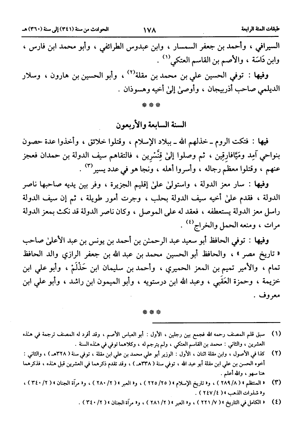 (4) «الكامل في التاريخ» (7/ 221)، و «العبر» (2/ 281)، و «مرآة الجنان» (2/ 340).