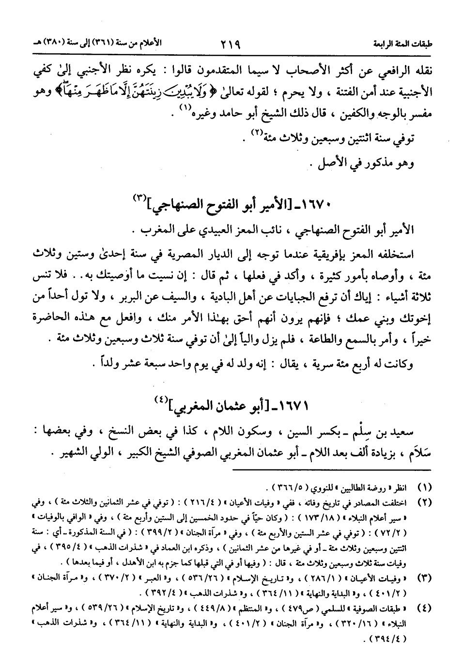 (4) «طبقات الصوفية» للسلمي (ص 479)، و «المنتظم» (8/ 449)، و «تاريخ الإسلام» (26/ 539)، و «سير أعلام النبلاء» (16/ 320)، و «مرآة الجنان» (2/ 401)، و «البداية والنهاية» (11/ 364)، و «شذرات الذهب» (4/ 394).