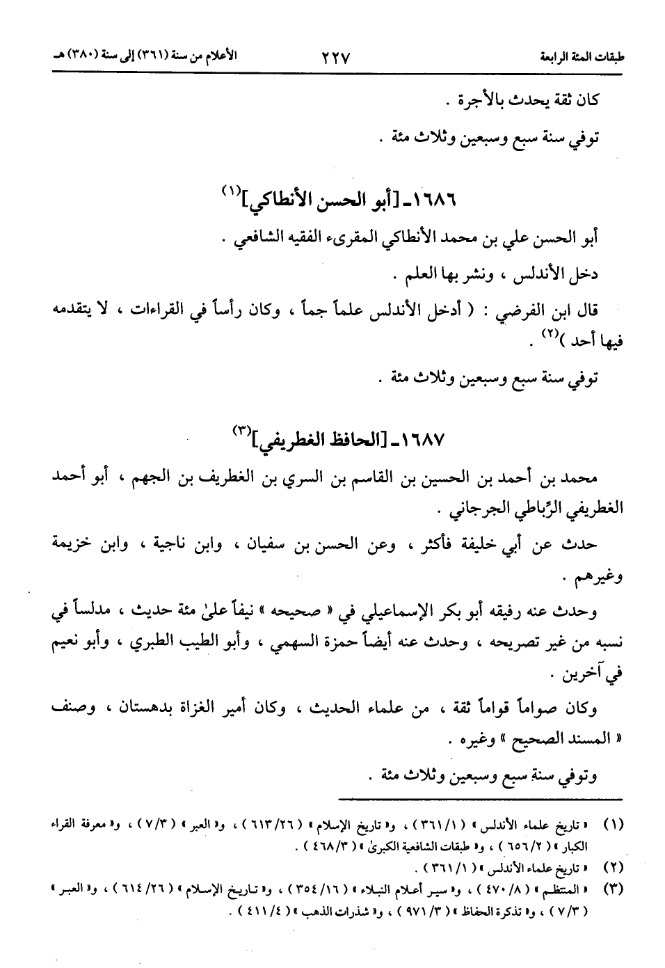 (1) «تاريخ علماء الأندلس» (1/ 361)، و «تاريخ الإسلام» (26/ 613)، و «العبر» (3/ 7)، و «معرفة القراء الكبار» (2/ 656)، و «طبقات الشافعية الكبرى» (3/ 468).