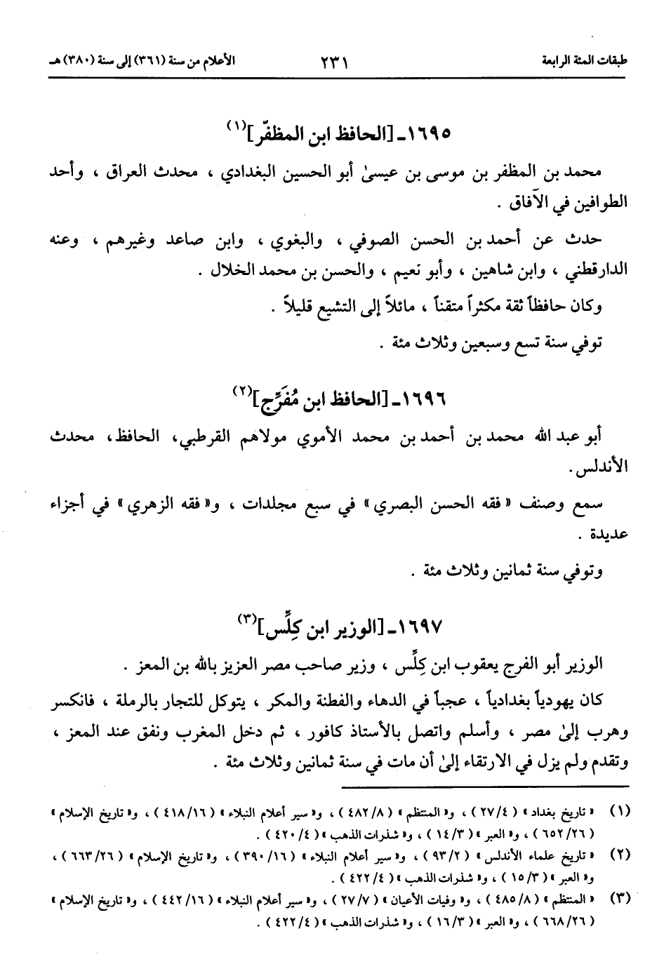 (1) «تاريخ بغداد» (4/ 27)، و «المنتظم» (8/ 482)، و «سير أعلام النبلاء» (16/ 418)، و «تاريخ الإسلام» (26/ 652)، و «العبر» (3/ 14)، و «شذرات الذهب» (4/ 420).