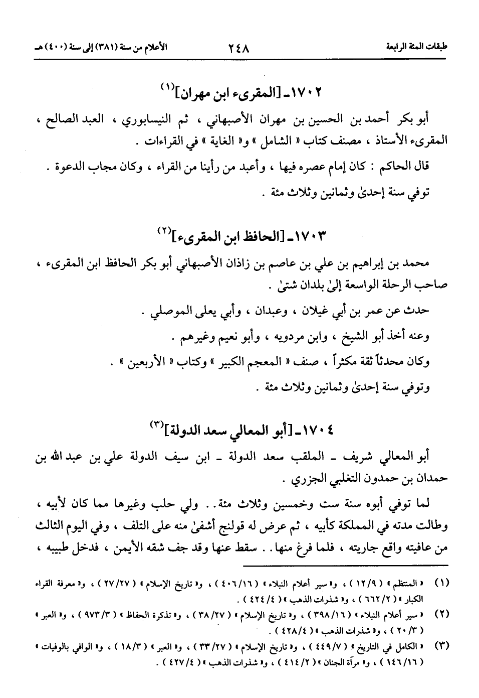 (1) «المنتظم» (9/ 12)، و «سير أعلام النبلاء» (16/ 406)، و «تاريخ الإسلام» (27/ 27)، و «معرفة القراء الكبار» (2/ 662)، و «شذرات الذهب» (4/ 424).