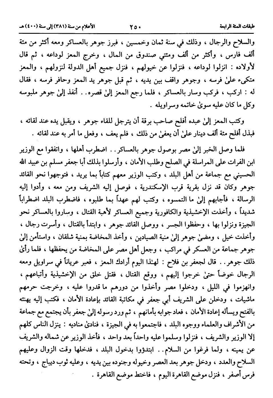 فلما وصل الخبر إلى مصر بوصول جوهر بالعساكر .. اضطرب أهلها، واتفقوا مع الوزير ابن الفرات على المراسلة في الصلح وطلب الأمان، وأرسلوا بذلك أبا جعفر مسلم بن عبيد الله الحسيني مع جماعة من أهل البلد، وكتب الوزير معهم كتابا بما يريد، فتوجهوا نحو القائد جوهر وكان قد نزل بقرية قرب الإسكندرية، فوصل إليه الشريف ومن معه، وأدوا إليه الرسالة، فأجابهم إلى ما التمسوه، وكتب لهم عهدا بما طلبوه، فاضطرب البلد اضطرابا شديدا، وأخذت الإخشيذية والكافورية وجميع العساكر لأهبة القتال، وساروا بالعساكر نحو الجيزة ونزلوا بها، وحفظوا الجسر، ووصل القائد جوهر، وابتدأ بالقتال، وأسرت رجال، وأخذت خيل، ومضى جوهر إلى منية الصيادين، وأخذ المخاضة بمنية شلقان، واستأمن إلى جوهر جماعة من العسكر في مراكب، وجعل أهل مصر على المخاضة من يحفظها، فلما رأى ذلك جوهر .. قال لجعفر بن فلاح: لهذا اليوم أرادك المعز، فعبر عريانا في سراويل ومعه الرجال خوضا حتى خرجوا إليهم، ووقع القتال، فقتل خلق من الإخشيذية وأتباعهم، وانهزموا في الليل، ودخلوا مصر وأخذوا من دورهم ما قدروا عليه، وخرجت حرمهم ماشيات، ودخلن على الشريف أبي جعفر في مكاتبة القائد بإعادة الأمان، فكتب إليه يهنئه بالفتح ويسأله إعادة الأمان، فعاد جوابه بأمانهم، ثم ورد رسوله إلى جعفر بأن يجتمع مع جماعة من الأشراف والعلماء ووجوه البلد، فاجتمعوا به في الجيزة، فنادى مناديه: ينزل الناس كلهم إلا الوزير والشريف، فنزلوا وسلموا عليه واحدا بعد واحد، فأخذ الوزير عن شماله والشريف عن يمينه، ولما فرغوا من السلام .. ابتدءوا بدخول البلد، فدخلها وقت الزوال وعليهم السلاح والعدد، ودخل جوهر بعد العصر وخيوله وجنوده بين يديه، وعليه ثوب ديباج، وتحته فرس أصفر، فنزل موضع القاهرة اليوم، فاختط موضع القاهرة.