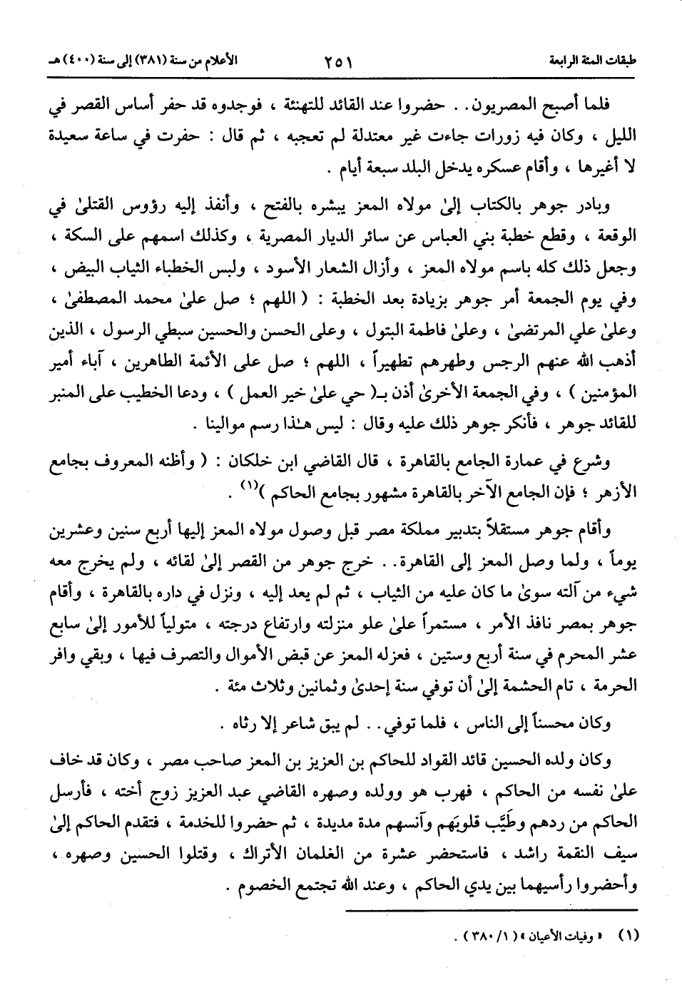 وأقام جوهر مستقلا بتدبير مملكة مصر قبل وصول مولاه المعز إليها أربع سنين وعشرين يوما، ولما وصل المعز إلى القاهرة .. خرج جوهر من القصر إلى لقائه، ولم يخرج معه شيء من آلته سوى ما كان عليه من الثياب، ثم لم يعد إليه، ونزل في داره بالقاهرة، وأقام جوهر بمصر نافذ الأمر، مستمرا على علو منزلته وارتفاع درجته، متوليا للأمور إلى سابع عشر المحرم في سنة أربع وستين، فعزله المعز عن قبض الأموال والتصرف فيها، وبقي وافر الحرمة، تام الحشمة إلى أن توفي سنة إحدى وثمانين وثلاث مائة.