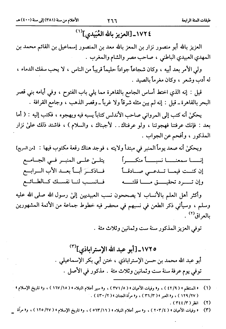 وأكثر أهل العلم بالأنساب لا يصححون نسب العبيديين إلى رسول الله صلّى الله عليه وسلم، وسيأتي ذكر الطعن في نسبهم في محضر فيه خطوط جماعة من الأئمة المشهورين بالعراق (2).