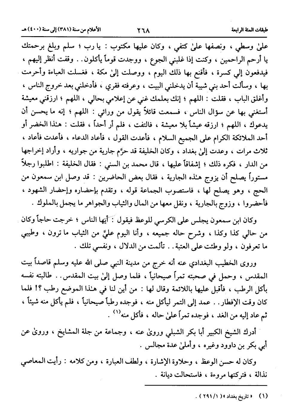 على وسطي، ونصفها على كتفي، وكان عليها مكتوب: يا رب؛ سلم وبلغ برحمتك يا أرحم الراحمين، وكنت إذا غلبني الجوع، ووجدت قوما يأكلون .. وقفت انظر إليهم، فيدفعون إلي كسرة، فأقنع بها ذلك اليوم، ووصلت إلى مكة، فغسلت العباءة وأحرمت بها، وسألت أحد بني شيبة أن يدخلني البيت، وعرفته فقري، فأدخلني بعد خروج الناس، وأغلق الباب، فقلت: اللهم؛ إنك بعلمك غني عن إعلامي بحالي، اللهم؛ ارزقني معيشة أستغني بها عن سؤال الناس، فسمعت قائلا يقول من ورائي: اللهم؛ إنه ما يحسن أن يدعوك، اللهم؛ ارزقه عيشا بلا معيشة، فالتفت، فلم أر أحدا، فقلت: هذا الخضر أو أحد الملائكة الكرام على الجميع السلام، فأعدت القول، فأعاد الدعاء، فأعدت فأعاد، ثلاث مرات، وعدت إلى بغداد، وكان الخليفة قد حرّم جارية من جواريه، وأراد إخراجها من الدار، فكره ذلك؛ إشفاقا عليها، قال محمد بن السني: فقال الخليفة: اطلبوا رجلا مستورا يصلح أن يزوج هذه الجارية، فقال بعض الحاضرين: قد وصل ابن سمعون من الحج، وهو يصلح لها، فاستصوب الجماعة قوله، وتقدم بإحضاره وإحضار الشهود، فأحضروا، وزوج بالجارية، ونقل معها من المال والثياب والجواهر ما يجمل بالملوك.