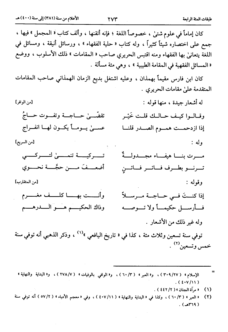 (2) «العبر» (3/ 60)، وكذا في «البداية والنهاية» (11/ 407)، وفي «معجم الأدباء» (2/ 57) أنه توفي سنة (369 هـ).