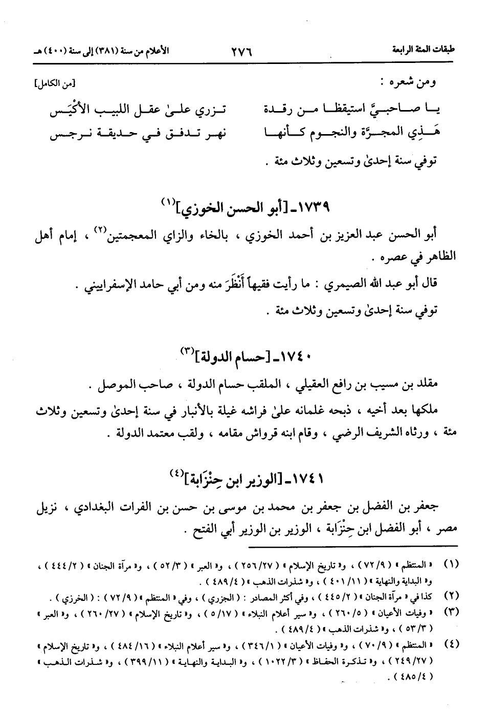 (4) «المنتظم» (9/ 70)، و «وفيات الأعيان» (1/ 346)، و «سير أعلام النبلاء» (16/ 484)، و «تاريخ الإسلام» (27/ 249)، و «تذكرة الحفاظ» (3/ 1022)، و «البداية والنهاية» (11/ 399)، و «شذرات الذهب» (4/ 485).