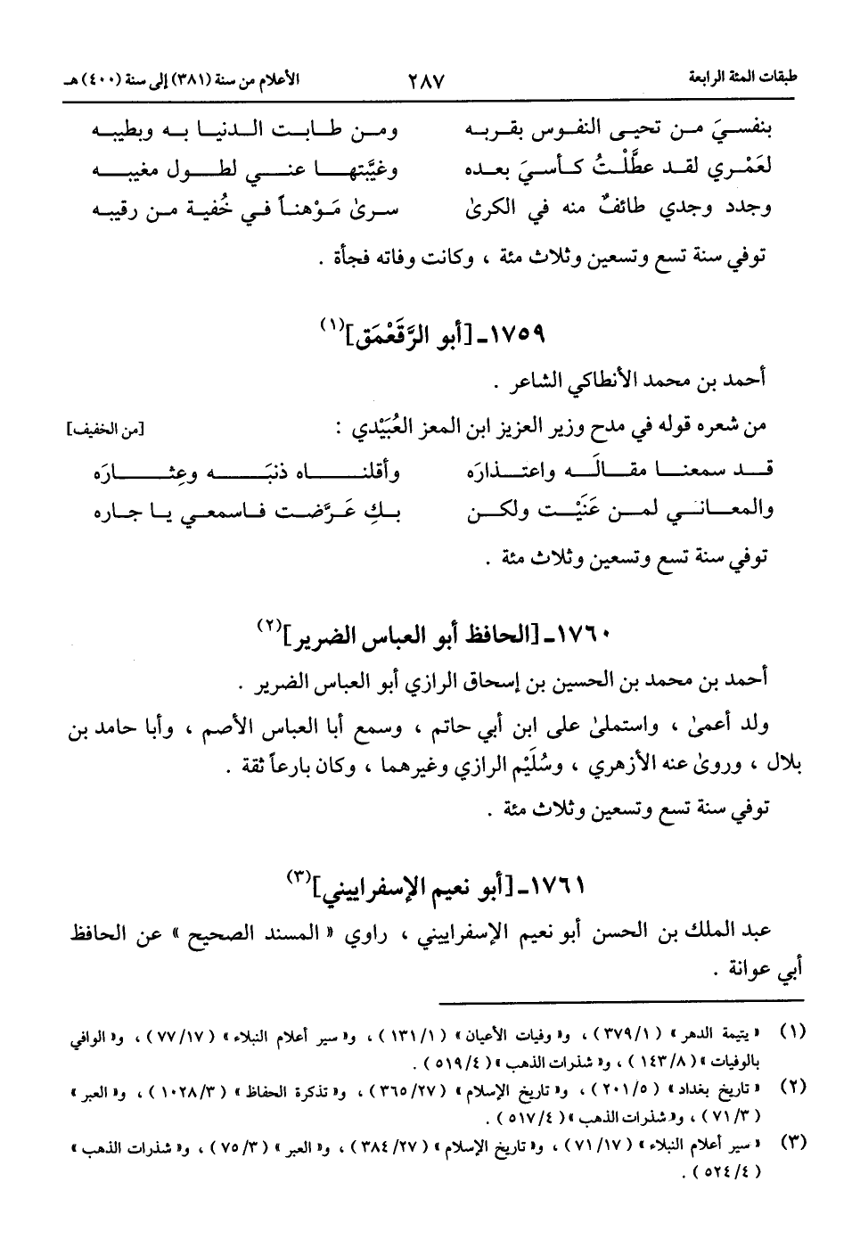 (2) «تاريخ بغداد» (5/ 201)، و «تاريخ الإسلام» (27/ 365)، و «تذكرة الحفاظ» (3/ 1028)، و «العبر» (3/ 71)، و «شذرات الذهب» (4/ 517).