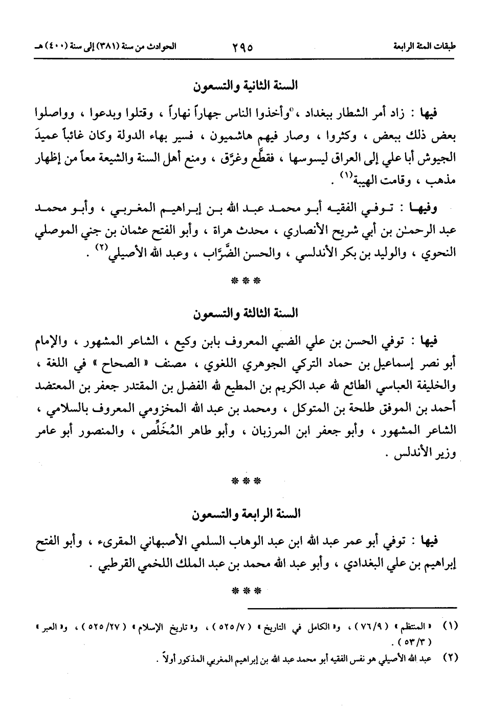(1) «المنتظم» (9/ 76)، و «الكامل في التاريخ» (7/ 525)، و «تاريخ الإسلام» (27/ 525)، و «العبر» (3/ 53).