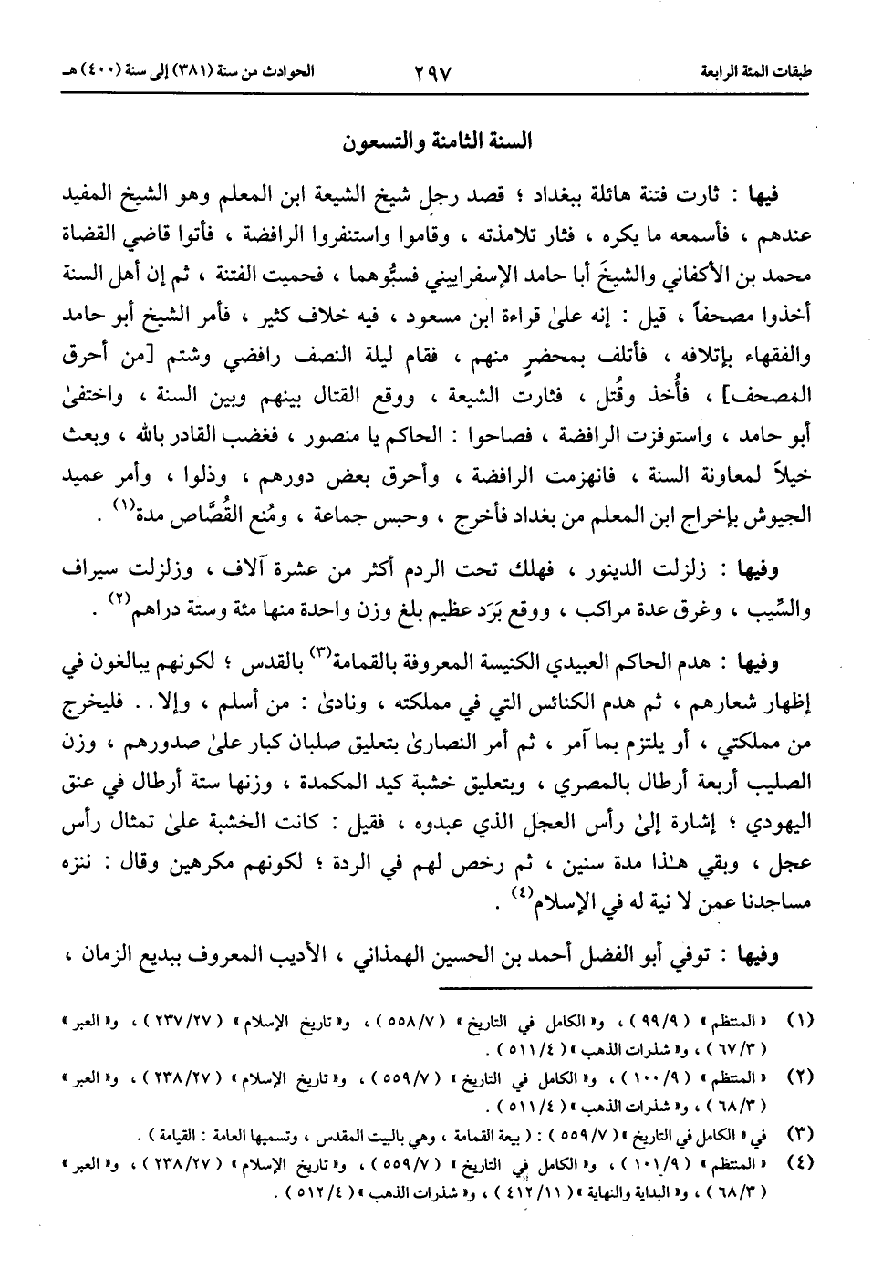 فيها: ثارت فتنة هائلة ببغداد؛ قصد رجل شيخ الشيعة ابن المعلم وهو الشيخ المفيد عندهم، فأسمعه ما يكره، فثار تلامذته، وقاموا واستنفروا الرافضة، فأتوا قاضي القضاة محمد بن الأكفاني والشيخ أبا حامد الأسفراييني فسبّوهما، فحميت الفتنة، ثم إن أهل السنة أخذوا مصحفا، قيل: إنه على قراءة ابن مسعود، فيه خلاف كثير، فأمر الشيخ أبو حامد والفقهاء بإتلافه، فأتلف بمحضر منهم، فقام ليلة النصف رافضي وشتم [من أحرق المصحف]، فأخذ وقتل، فثارت الشيعة، ووقع القتال بينهم وبين السنة، واختفى أبو حامد، واستوفزت الرافضة، فصاحوا: الحاكم يا منصور، فغضب القادر بالله، وبعث خيلا لمعاونة السنة، فانهزمت الرافضة، وأحرق بعض دورهم، وذلوا، وأمر عميد الجيوش بإخراج ابن المعلم من بغداد فأخرج، وحبس جماعة، ومنع القصّاص مدة (1).