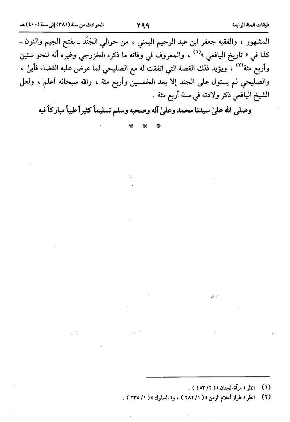 المشهور، والفقيه جعفر ابن عبد الرحيم اليمني، من حوالي الجند-بفتح الجيم والنون- كذا في «تاريخ اليافعي» (1)، والمعروف في وفاته ما ذكره الخزرجي وغيره أنه لنحو ستين وأربع مائة (2)، ويؤيد ذلك القصة التي اتفقت له مع الصليحي لما عرض عليه القضاء فأبى، والصليحي لم يستول على الجند إلا بعد الخمسين وأربع مائة، والله سبحانه أعلم، ولعل الشيخ اليافعي ذكر ولادته في سنة أربع مائة.