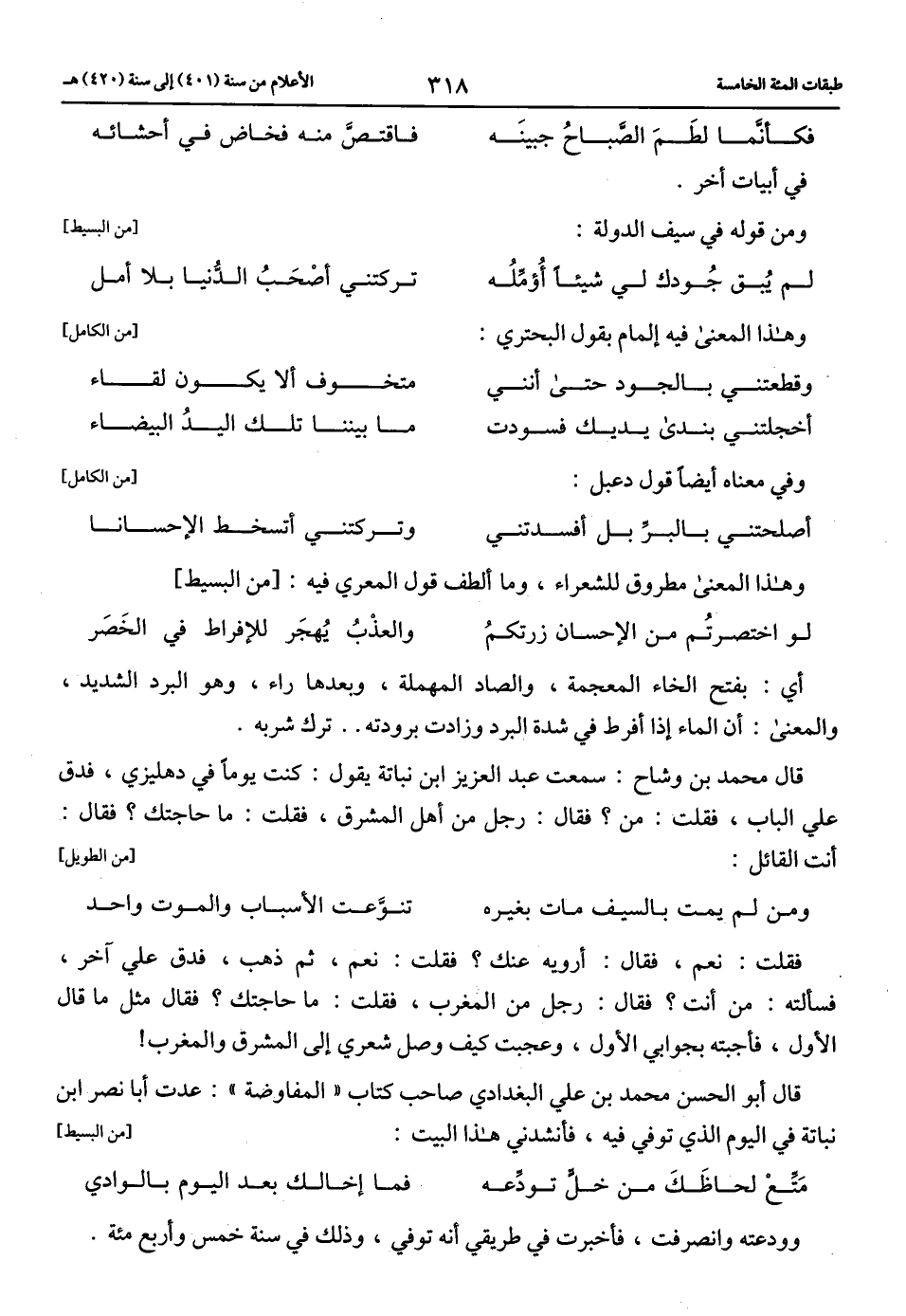 قال أبو الحسن محمد بن علي البغدادي صاحب كتاب «المفاوضة»: عدت أبا نصر ابن نباتة في اليوم الذي توفي فيه، فأنشدني هذا البيت: [من البسيط]