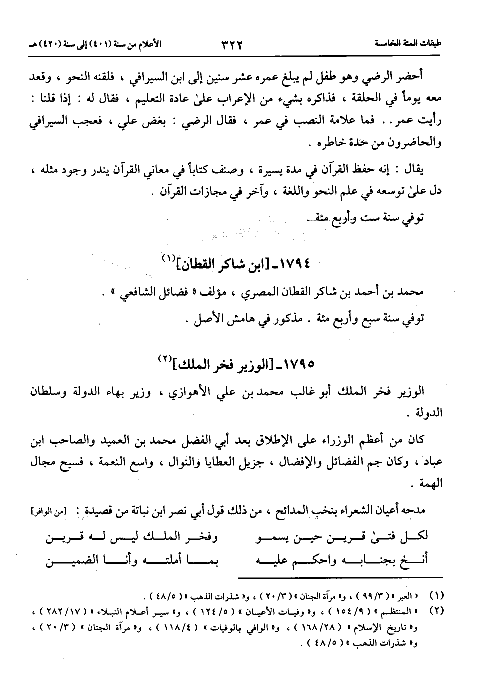 (2) «المنتظم» (9/ 154)، و «وفيات الأعيان» (5/ 124)، و «سير أعلام النبلاء» (17/ 282)، و «تاريخ الإسلام» (28/ 168)، و «الوافي بالوفيات» (4/ 118)، و «مرآة الجنان» (3/ 20)، و «شذرات الذهب» (5/ 48).