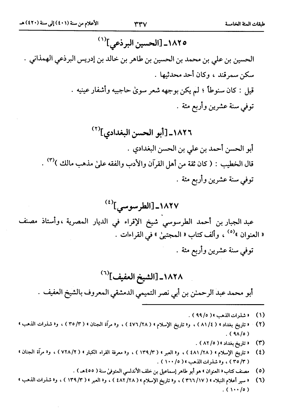 (2) «تاريخ بغداد» (4/ 81)، و «تاريخ الإسلام» (28/ 476)، و «مرآة الجنان» (3/ 35)، و «شذرات الذهب» (5/ 98).