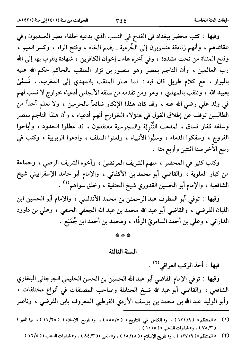 وفيها: كتب محضر ببغداد في القدح في النسب الذي يدعيه خلفاء مصر العبيديون وفي عقائدهم، وأنهم زنادقة منسوبون إلى الخرمية-بضم الخاء، وفتح الراء، وكسر الميم، وفتح المثناة من تحت مشددة، وفي آخره هاء-إخوان الكافرين، شهادة يتقرب بها إلى الله رب العالمين، وأن الناجم بمصر وهو منصور بن نزار الملقب بالحاكم حكم الله عليه بالبوار، مع كلام طويل قال فيه: لما صار الملقب بالمهدي إلى المغرب .. تسمّى بعبيد الله، وتلقب بالمهدي، وهو ومن تقدمه من سلفه الأنجاس أدعياء خوارج لا نسب لهم في ولد علي رضي الله عنه، وقد كان هذا الإنكار شائعا بالحرمين، ولا نعلم أحدا من الطالبيين توقف عن إطلاق القول في هؤلاء الخوارج أنهم أدعياء، وأن هذا الناجم بمصر وسلفه كفار فساق، لمذهب الثّنويّة والمجوسية معتقدون، قد عطلوا الحدود، وأباحوا الفروج، وسفكوا الدماء، وسبّوا الأنبياء، ولعنوا السلف، وادعوا الربوبية، وكتب في ربيع الآخر سنة اثنتين وأربع مائة.