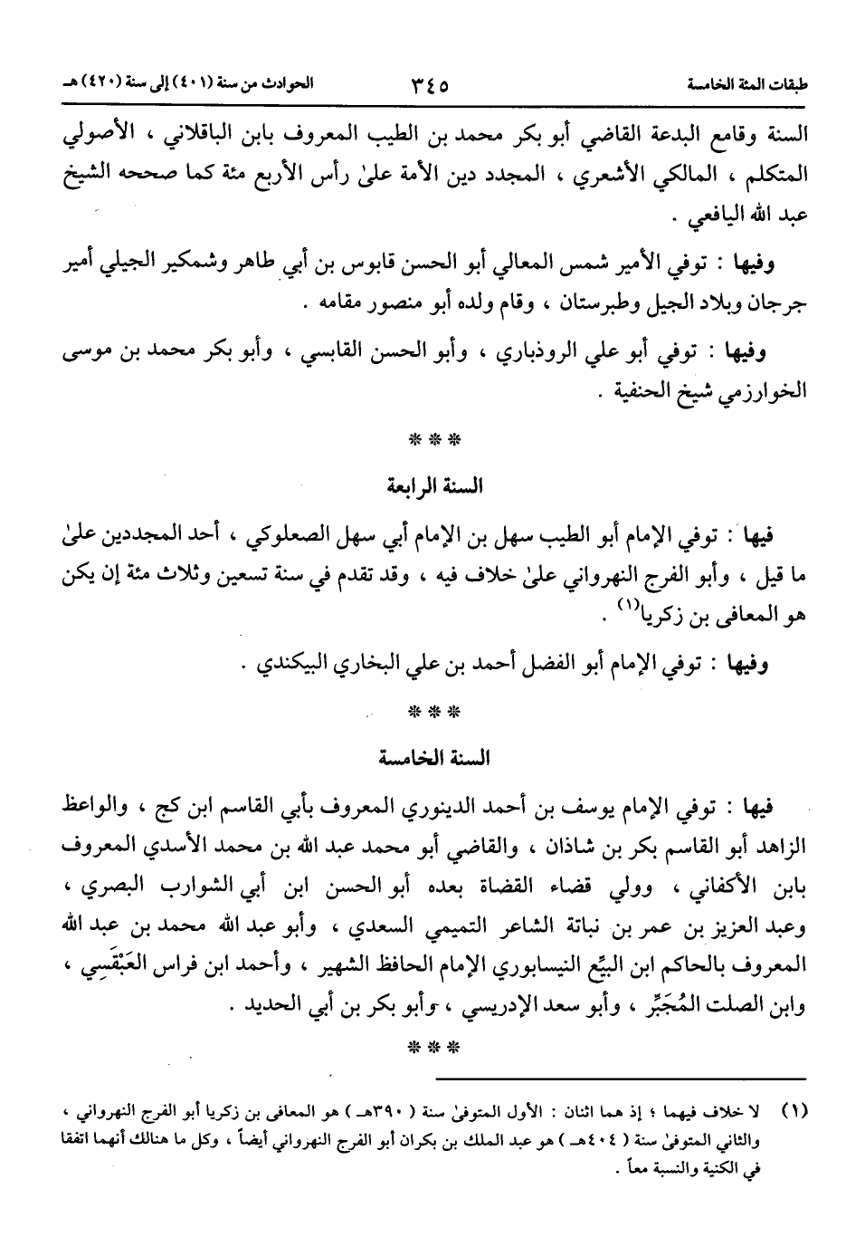فيها: توفي الإمام أبو الطيب سهل بن الإمام أبي سهل الصعلوكي، أحد المجددين على ما قيل، وأبو الفرج النهرواني على خلاف فيه، وقد تقدم في سنة تسعين وثلاث مائة إن يكن هو المعافى بن زكريا (1).