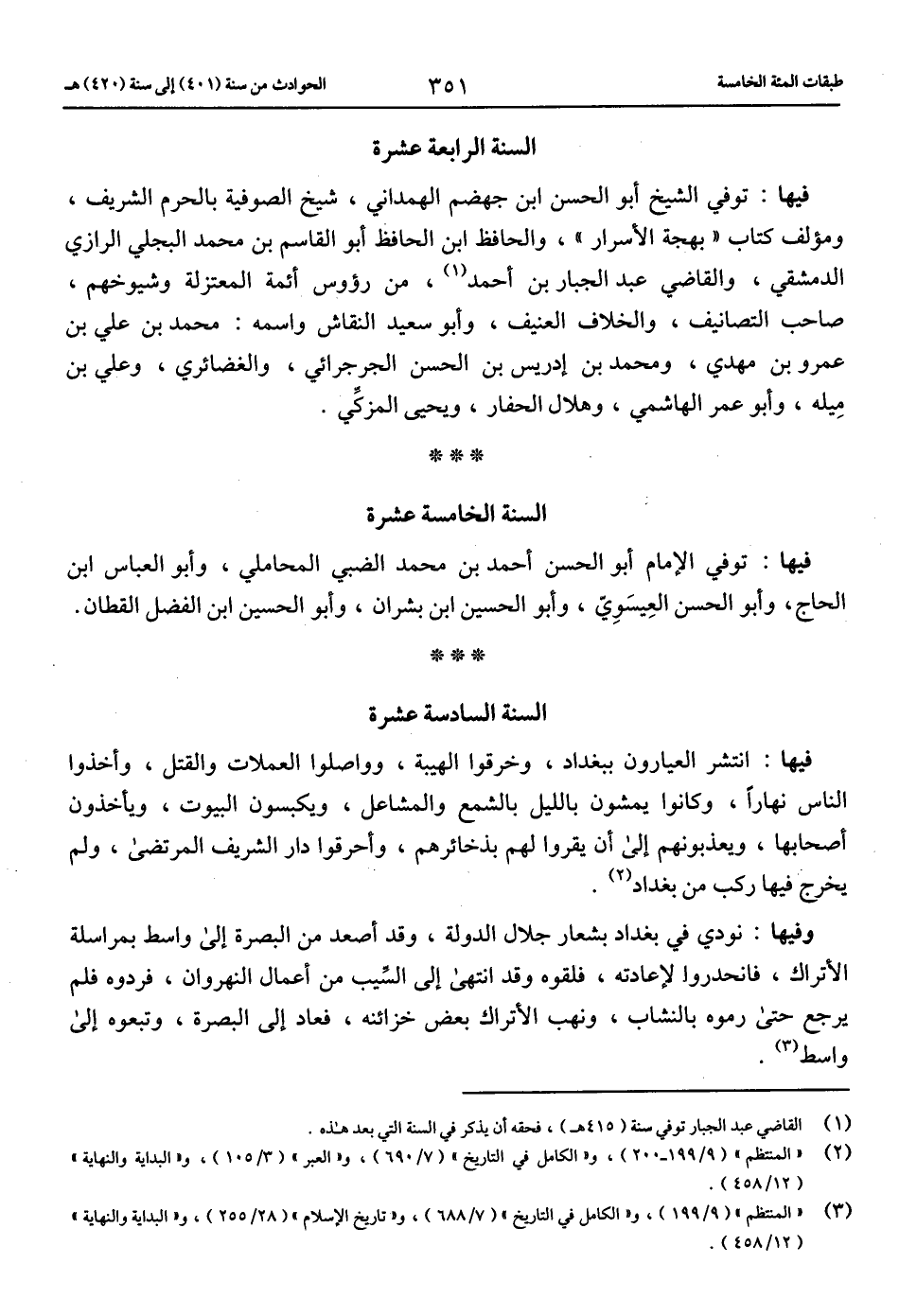 (1) القاضي عبد الجبار توفي سنة (415 هـ)، فحقه أن يذكر في السنة التي بعد هذه.