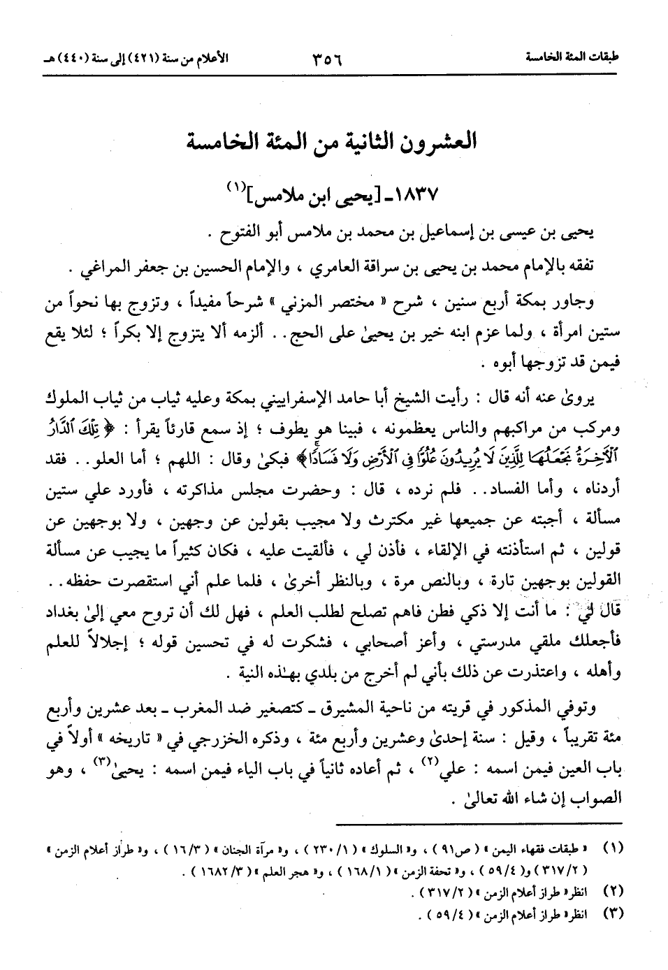 وتوفي المذكور في قريته من ناحية المشيرق-كتصغير ضد المغرب-بعد عشرين وأربع مائة تقريبا، وقيل: سنة إحدى وعشرين وأربع مائة، وذكره الخزرجي في «تاريخه» أولا في باب العين فيمن اسمه: علي (2)، ثم أعاده ثانيا في باب الياء فيمن اسمه: يحيى (3)، وهو الصواب إن شاء الله تعالى.