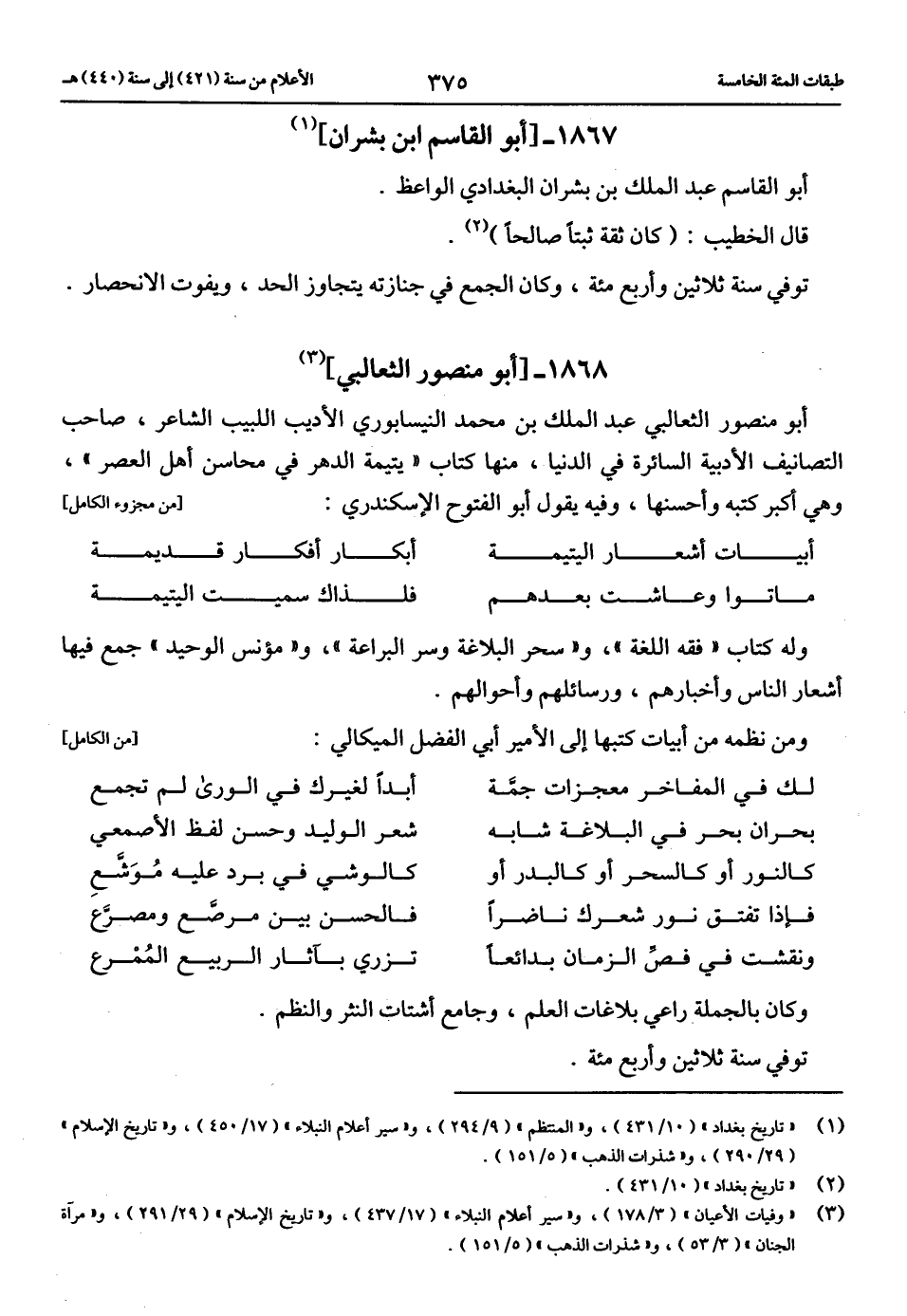 أبو منصور الثعالبي عبد الملك بن محمد النيسابوري الأديب اللبيب الشاعر، صاحب التصانيف الأدبية السائرة في الدنيا، منها كتاب «يتيمة الدهر في محاسن أهل العصر»، وهي أكبر كتبه وأحسنها، وفيه يقول أبو الفتوح الإسكندري: [من مجزوء الكامل]