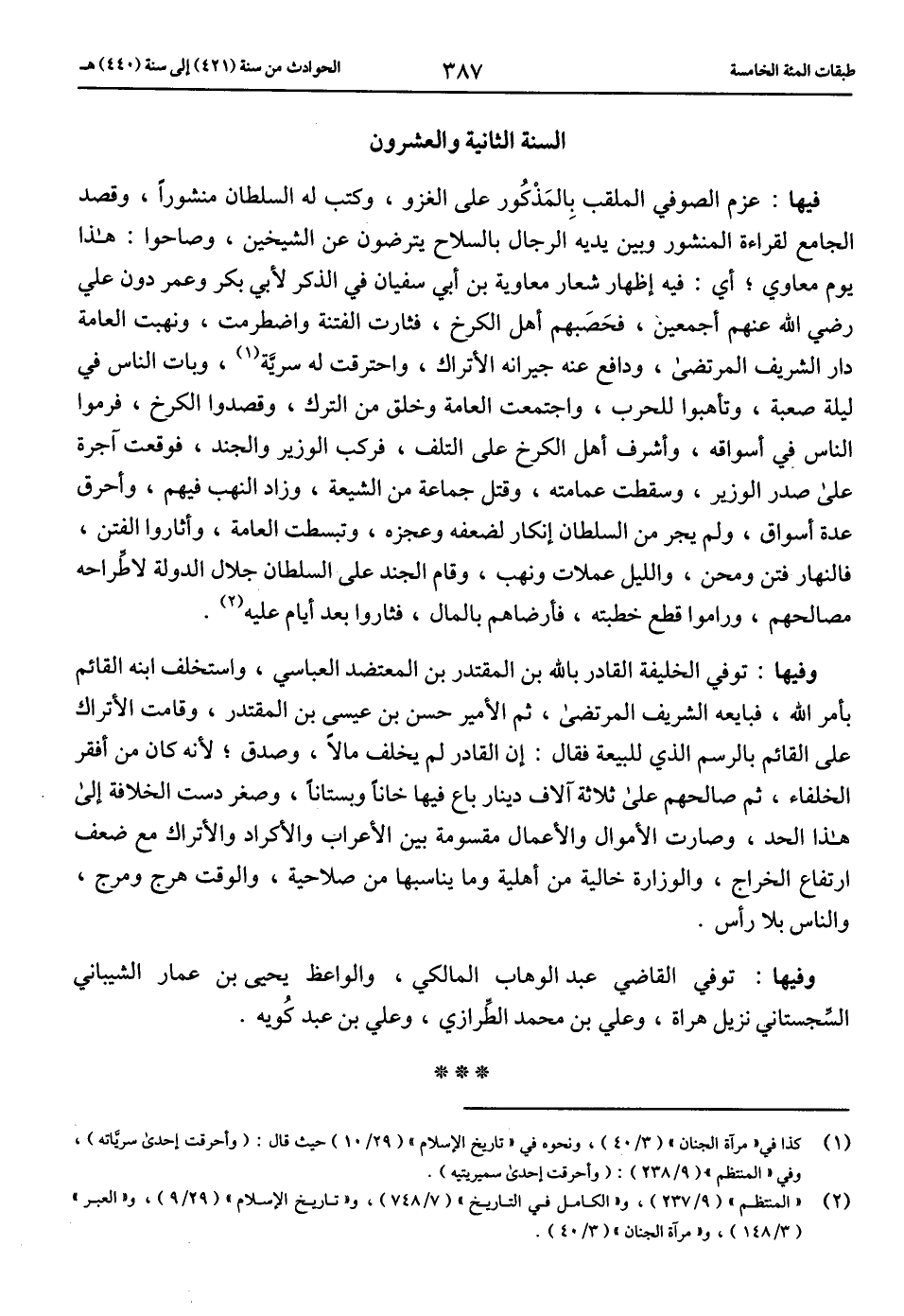 (2) «المنتظم» (9/ 237)، و «الكامل في التاريخ» (7/ 748)، و «تاريخ الإسلام» (29/ 9)، و «العبر» (3/ 148)، و «مرآة الجنان» (3/ 40).