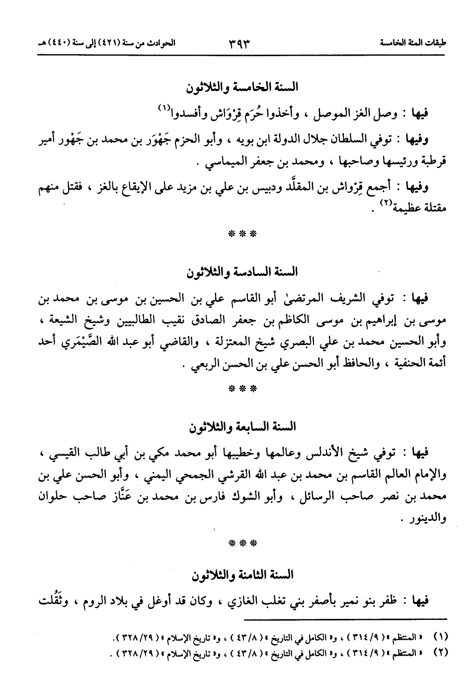 (1) «المنتظم» (9/ 314)، و «الكامل في التاريخ» (8/ 43)، و «تاريخ الإسلام» (29/ 328).