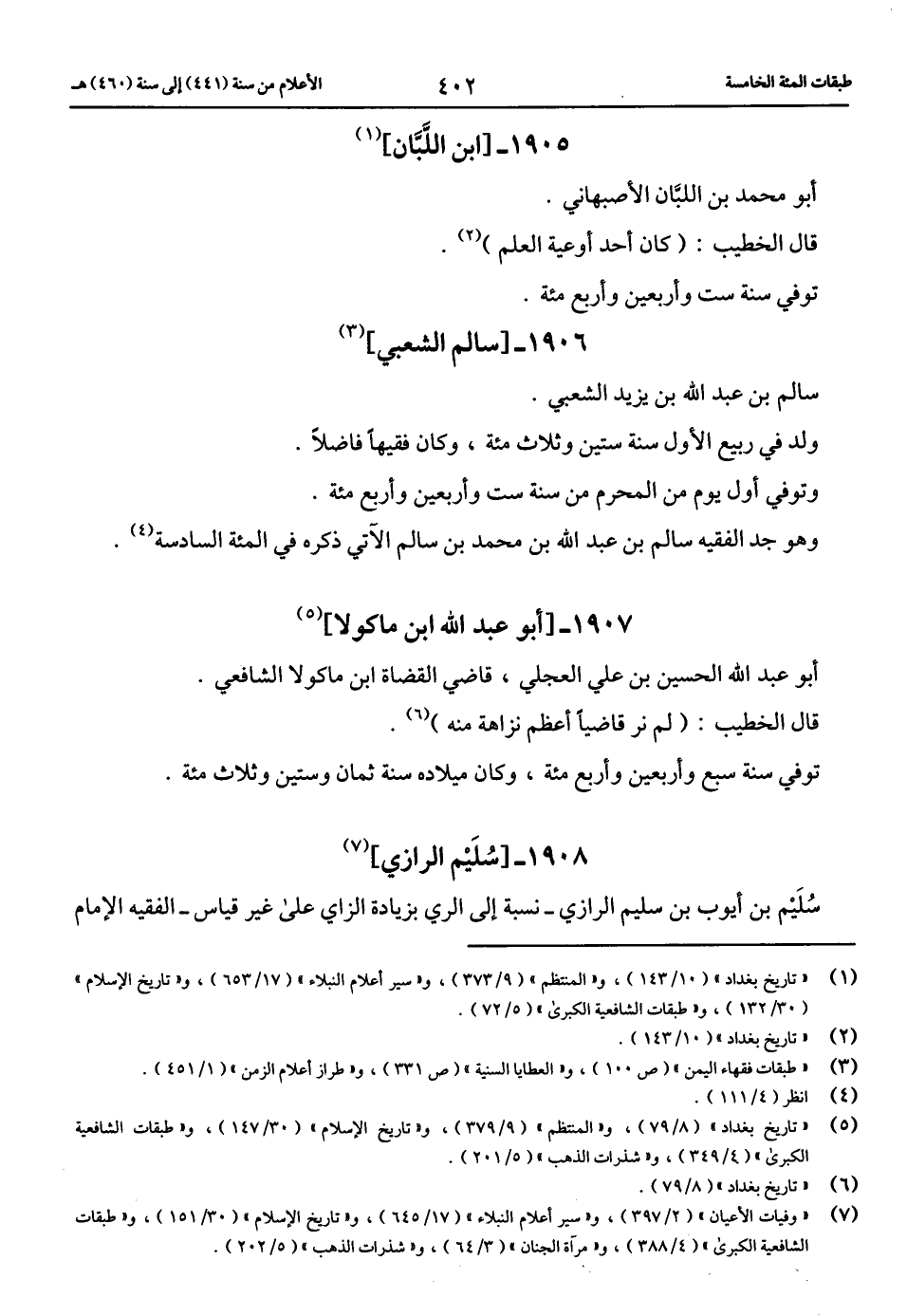 (5) «تاريخ بغداد» (8/ 79)، و «المنتظم» (9/ 379)، و «تاريخ الإسلام» (30/ 147)، و «طبقات الشافعية الكبرى» (4/ 349)، و «شذرات الذهب» (5/ 201).