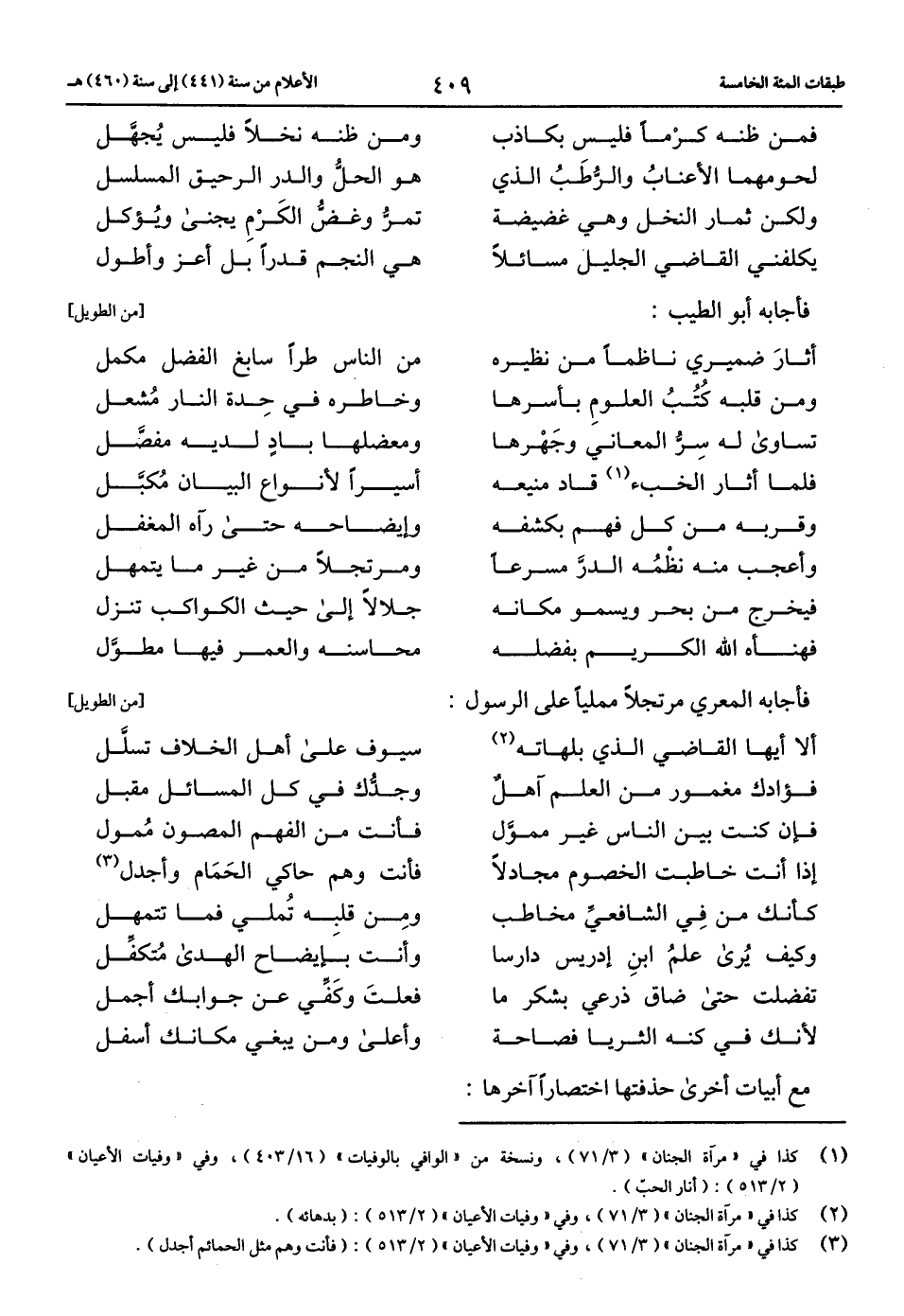 (3) كذا في «مرآة الجنان» (3/ 71)، وفي «وفيات الأعيان» (2/ 513): (فأنت وهم مثل الحمائم أجدل).